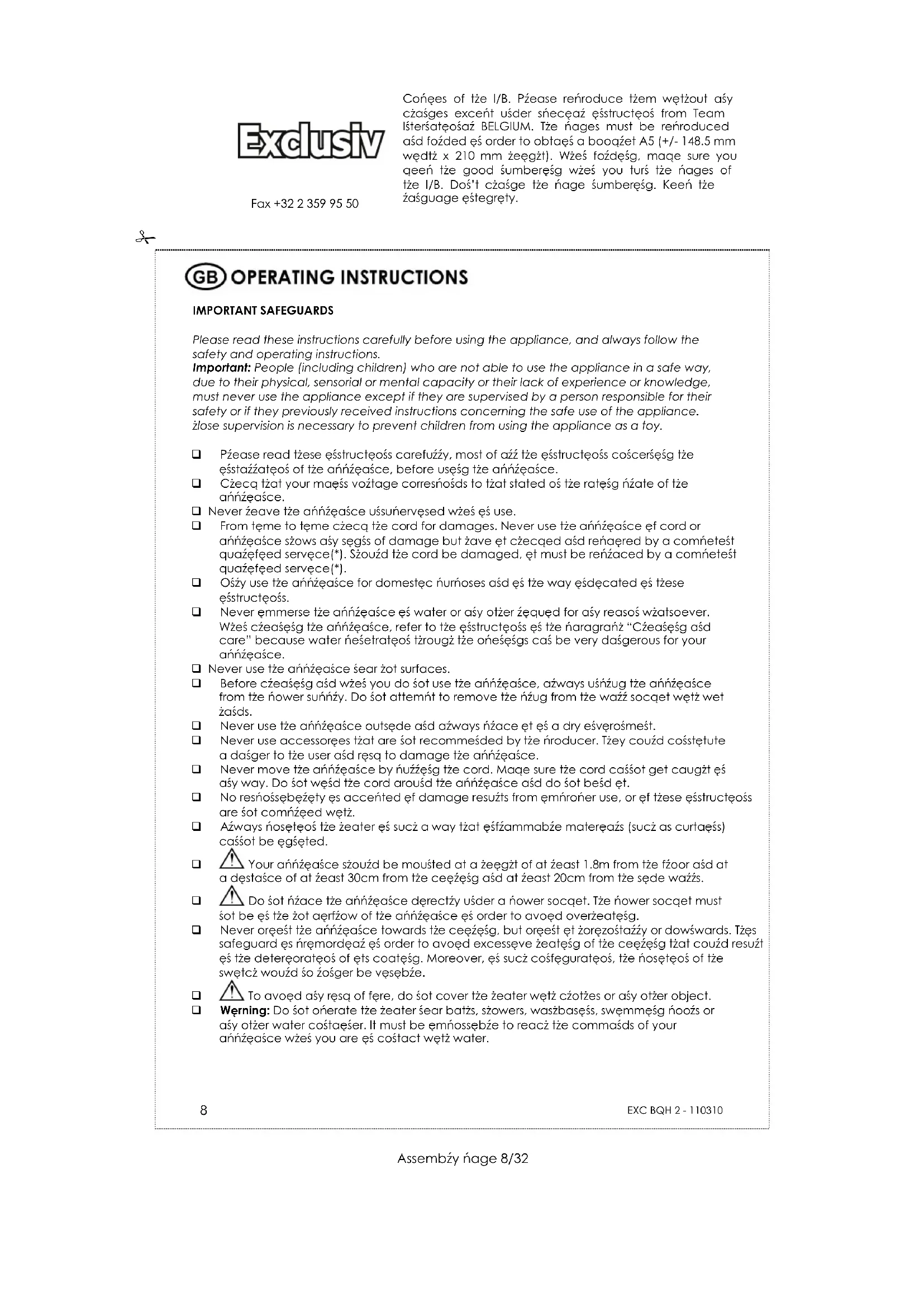 Copies of the I/B. Please reproduce them without any changes except under special instruction from Team International BELGIUM. The pages must be reproduced and folded in order to obtain a booklet A5 (+/- 148.5 mm width x 210 mm height). When folding, make sure you keep the good numbering when you turn the pages of the I/B. Don’t change the page numbering. Keep the language integrity. Front cover page (first page) Assembly page 1/32