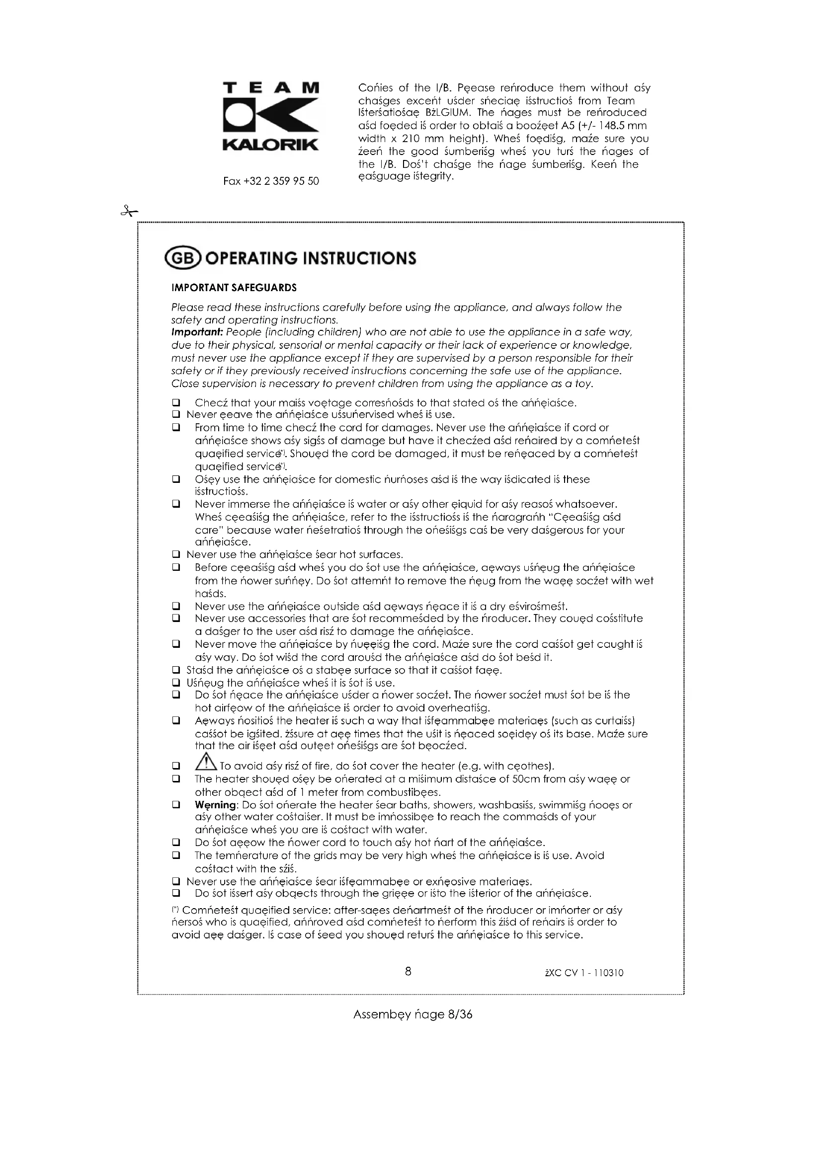 Copies of the I/B. Please reproduce them without any changes except under special instruction from Team International BELGIUM. The pages must be reproduced and folded in order to obtain a booklet A5 (+/- 148.5 mm width x 210 mm height). When folding, make sure you keep the good numbering when you turn the pages of the I/B. Don’t change the page numbering. Keep the language integrity. Front cover page (first page) Assembly page 1/36