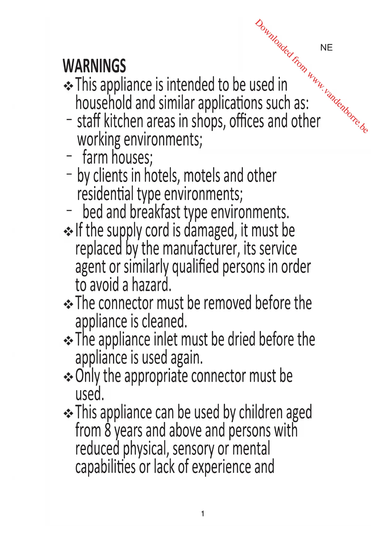 Downloaded from www.vandenborre.beNE knowledge if they have been given supervision or inst concerning use of the appliance in a safe way and understand the hazards involved. Children shall not play with the appliance. Cleaning and user maintenance shall not be made by children unless they are older than 8 and supervised. Keep the appliance and its cord out of reach of children less than 8 years. The appliance is not intended to be operated by means of an external mer or separate remote-control system. Regarding the inst for cleaning surfaces in contact with food, refer to the “Cleaning and Maintenance” on page 5 of the manual. The outer surface may get hot when the appliance is opera The surfaces are liable to get hot during use. The temperature of accessible surfaces may be high when the appliance is opera Do not touch hot surface. Use the handle