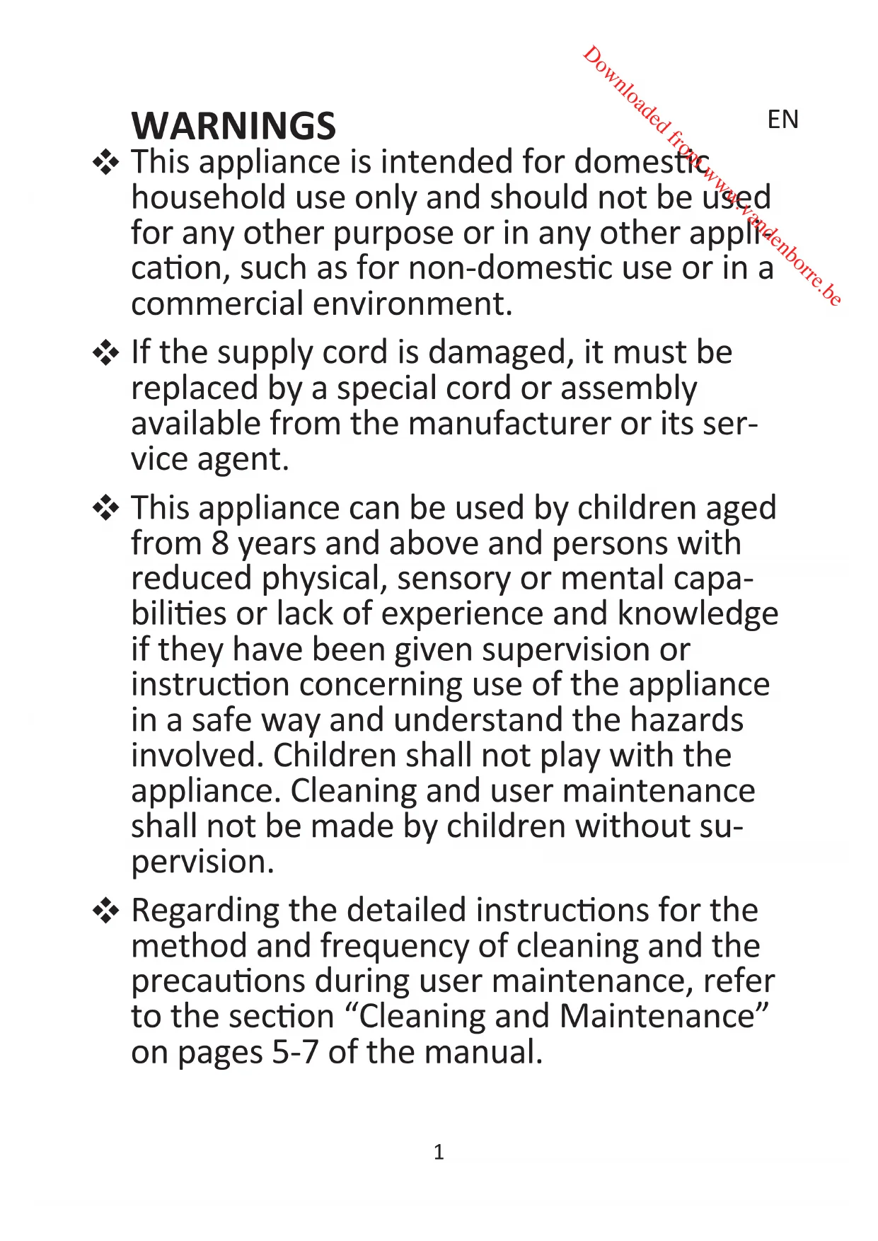 HANDLEIDING BVCA700SC Downloaded from www.vandenborre.beCatalogue Language of introduction Page English - - - - - - - - - - - - - - - - - - - - - - - - - - - 1 - 8 French - - - - - - - - - - - - - - - - - - - - - - - - - - - 9 - 18 Dutch - - - - - - - - - - - - - - - - - - - - - - - - - - - - 19 - 27 Downloaded from www.vandenborre.beWARNINGS This appliance is intended for domesc household use only and should not be used for any other purpose or in any other appli- caon, such as for non-domesc use or in a commercial environment. If the supply cord is damaged, it must be replaced by a special cord or assembly available from the manufacturer or its ser- vice agent. This appliance can be used by children aged from 8 years and above and persons with reduced physical, sensory or mental capa- bilies or lack of experience and knowledge if they have been given supervision or instrucon concerning use of the appliance in a safe way and understand the hazards involved. Children shall not play with the appliance. Cleaning and user maintenance shall not be made by children without su- pervision. Regarding the detailed instrucons for the method and frequency of cleaning and the precauons during user maintenance, refer to the secon “Cleaning and Maintenance” on pages 5-7 of the manual.
