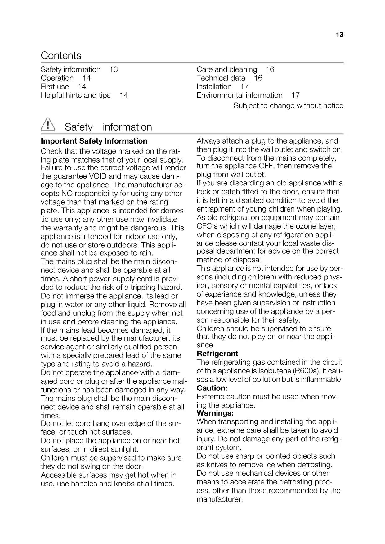 12Contents Safety information 13 Operation 14 First use 14 Helpful hints and tips 14 Care and cleaning 16 Technical data 16 Installation 17 Environmental information 17 Subject to change without notice Safety information Important Safety Information Check that the voltage marked on the rat- ing plate matches that of your local supply. Failure to use the correct voltage will render the guarantee VOID and may cause dam- age to the appliance. The manufacturer ac- cepts NO responsibility for using any other voltage than that marked on the rating plate. This appliance is intended for domes- tic use only; any other use may invalidate the warranty and might be dangerous. This appliance is intended for indoor use only, do not use or store outdoors. This appli- ance shall not be exposed to rain. The mains plug shall be the main discon- nect device and shall be operable at all times. A short power-supply cord is provi- ded to reduce the risk of a tripping hazard. Do not immerse the appliance, its lead or plug in water or any other liquid. Remove all food and unplug from the supply when not in use and before cleaning the appliance. If the mains lead becomes damaged, it must be replaced by the manufacturer, its service agent or similarly qualified person with a specially prepared lead of the same type and rating to avoid a hazard. Do not operate the appliance with a dam- aged cord or plug or after the appliance mal- functions or has been damaged in any way. The mains plug shall be the main discon- nect device and shall remain operable at all times. Do not let cord hang over edge of the sur- face, or touch hot surfaces. Do not place the appliance on or near hot surfaces, or in direct sunlight. Children must be supervised to make sure they do not swing on the door. Accessible surfaces may get hot when in use, use handles and knobs at all times. Always attach a plug to the appliance, and then plug it into the wall outlet and switch on. To disconnect from the mains completely, turn the appliance OFF, then remove the plug from wall outlet. If you are discarding an old appliance with a lock or catch fitted to the door, ensure that it is left in a disabled condition to avoid the entrapment of young children when playing. As old refrigeration equipment may contain CFC’s which will damage the ozone layer, when disposing of any refrigeration appli- ance please contact your local waste dis- posal department for advice on the correct method of disposal. This appliance is not intended for use by per- sons (including children) with reduced phys- ical, sensory or mental capabilities, or lack of experience and knowledge, unless they have been given supervision or instruction concerning use of the appliance by a per- son responsible for their safety. Children should be supervised to ensure that they do not play on or near the appli- ance. Refrigerant The refrigerating gas contained in the circuit of this appliance is Isobutene (R600a); it cau- ses a low level of pollution but is inflammable. Caution: Extreme caution must be used when mov- ing the appliance. Warnings: When transporting and installing the appli- ance, extreme care shall be taken to avoid injury. Do not damage any part of the refrig- erant system. Do not use sharp or pointed objects such as knives to remove ice when defrosting. Do not use mechanical devices or other means to accelerate the defrosting proc- ess, other than those recommended by the manufacturer. 13Do not use electrical appliances inside the food storage compartments of the appli- ance, unless they are of the type recommen- ded by the manufacturer. If the appliance is installed in a carpeted area, do not let the carpet block the ventila- tion holes in the base of the unit, adjust the levelling feet after a few hours to compen- sate for carpet movement. Keep ventilation openings, in the appliance enclosure or the built in structure clear of ob- structions. Operation Switching on Insert the plug into the wall socket. Turn the Temperature regulator clockwise. Switching off To turn off the appliance, turn the Tempera- ture regulator to the OFF position. Temperature regulation The temperature is automatically regulated. To operate the appliance, proceed as fol- lows: