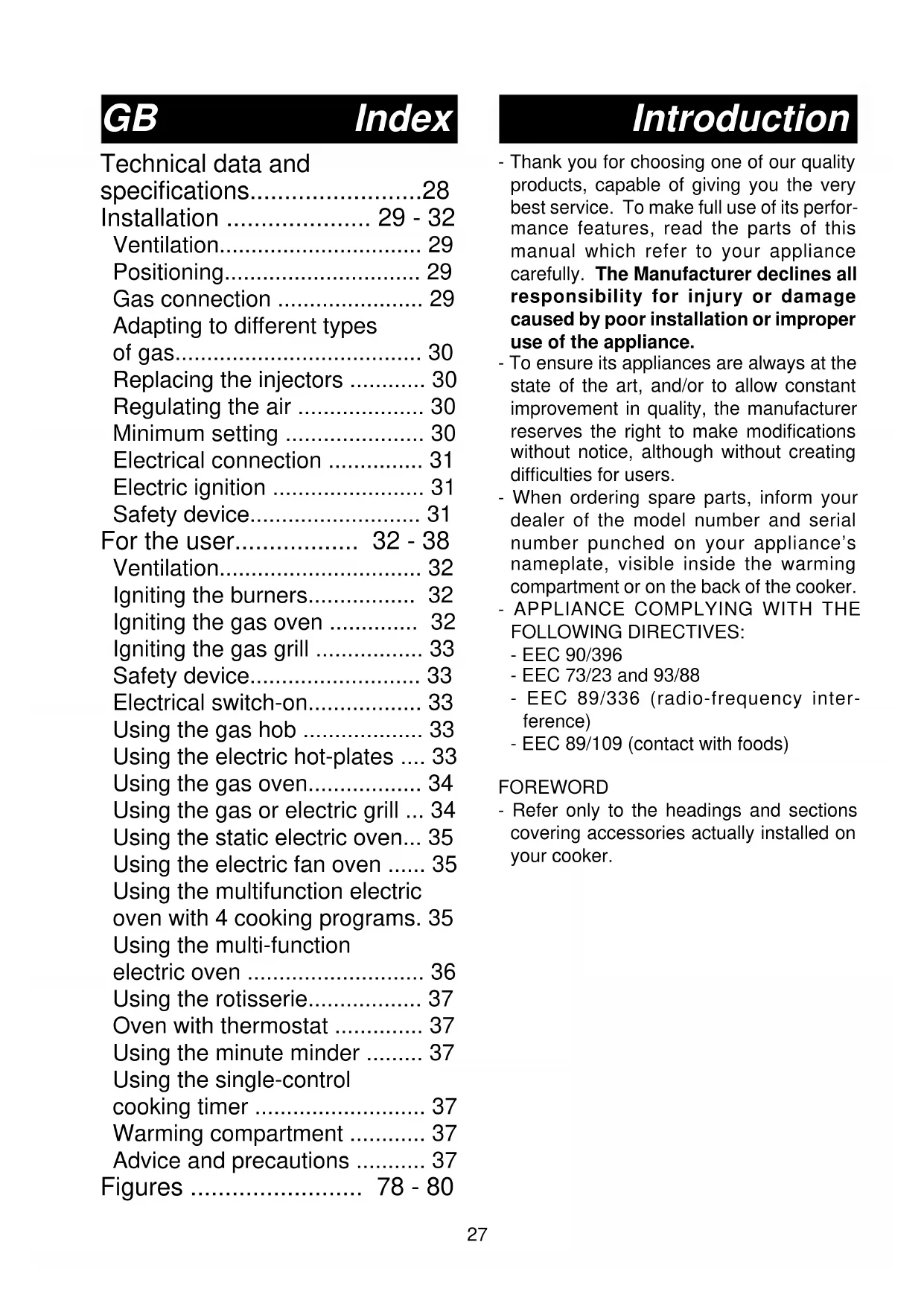 - FOLLOWING DIRECTIVES: - EEC 90/396 - EEC 73/23 and 93/88 - EEC 89/336 (radio-frequency inter- ference) - EEC 89/109 (contact with foods) FOREWORD - Refer only to the headings and sections covering accessories actually installed on your cooker. Technical data and specifications p. 28