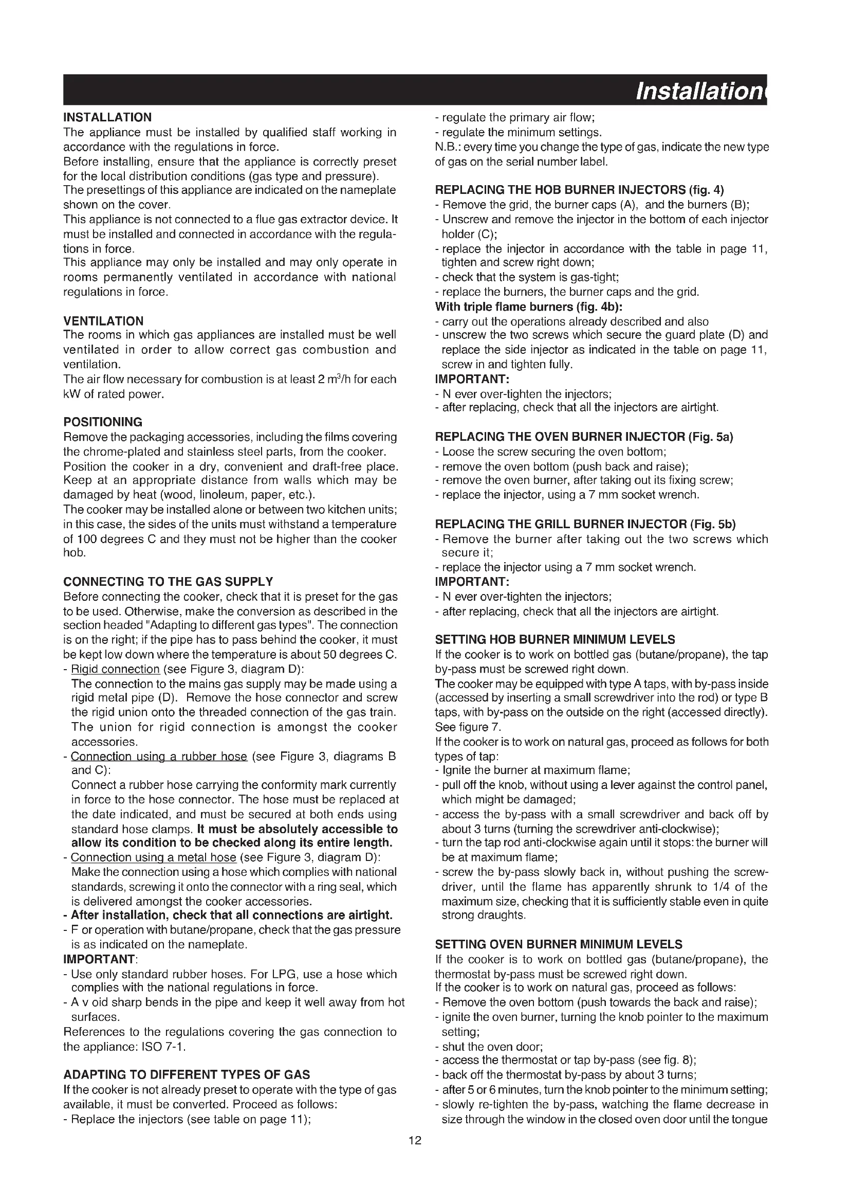 If the cooker is not already preset to operate with the type of gas available, it must be converted. Proceed as follows: - Replace the injectors (see table on page 11); InstallationGB - regulate the primary air flow; - regulate the minimum settings. N.B.: every time you change the type of gas, indicate the new type of gas on the serial number label. REPLACING THE HOB BURNER INJECTORS (fig. 4) - Remove the grid, the burner caps (A), and the burners (B); - Unscrew and remove the injector in the bottom of each injector holder (C); - replace the injector in accordance with the table in page 11, tighten and screw right down; - check that the system is gas-tight; - replace the burners, the burner caps and the grid. With triple flame burners (fig. 4b): - carry out the operations already described and also - unscrew the two screws which secure the guard plate (D) and replace the side injector as indicated in the table on page 11, screw in and tighten fully. IMPORTANT: -Never over-tighten the injectors; - after replacing, check that all the injectors are airtight. REPLACING THE OVEN BURNER INJECTOR (Fig. 5a) - Loose the screw securing the oven bottom; - remove the oven bottom (push back and raise); - remove the oven burner, after taking out its fixing screw; - replace the injector, using a 7 mm socket wrench. REPLACING THE GRILL BURNER INJECTOR (Fig. 5b) - Remove the burner after taking out the two screws which secure it; - replace the injector using a 7 mm socket wrench. IMPORTANT: -Never over-tighten the injectors; - after replacing, check that all the injectors are airtight.