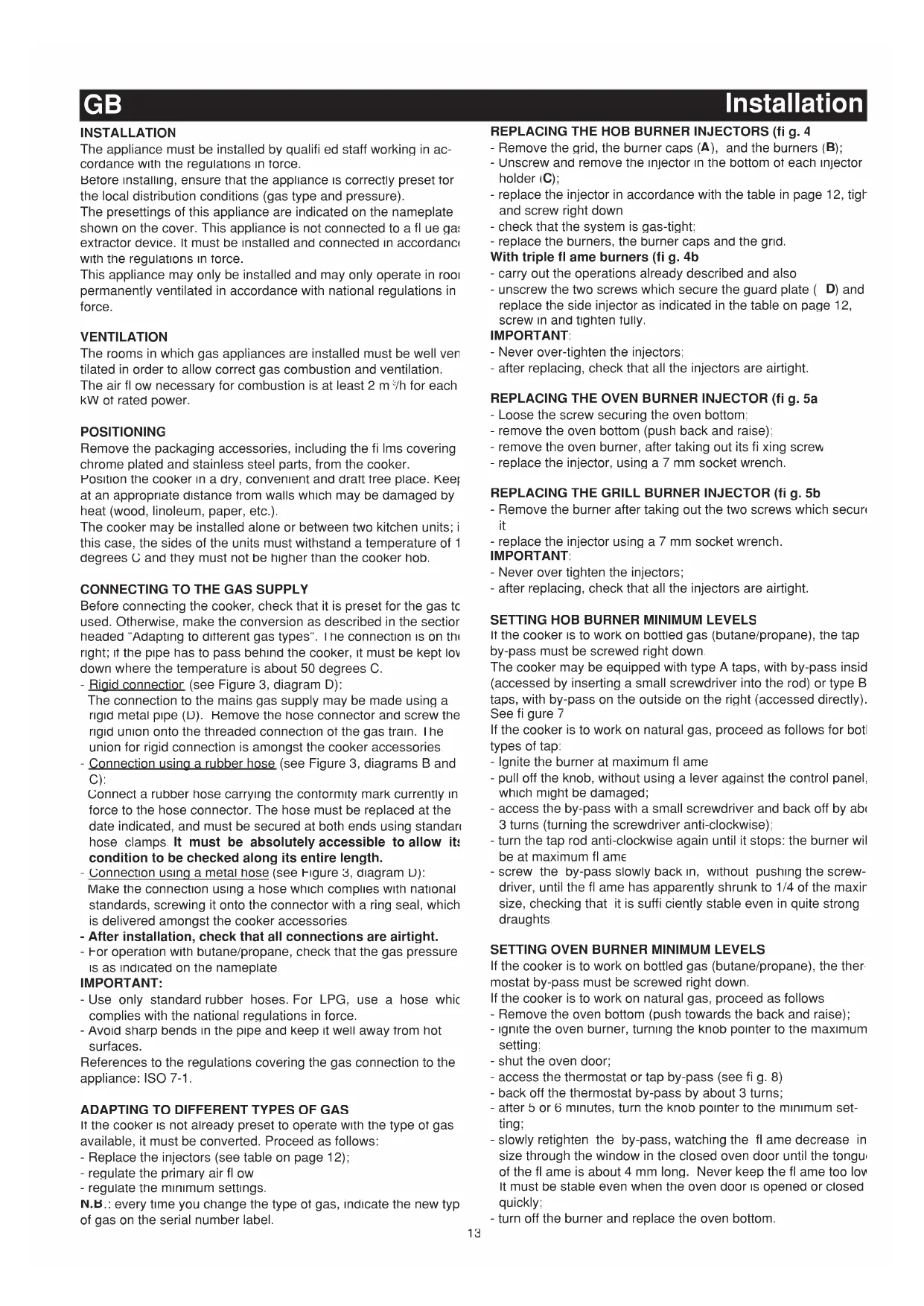 ) and replace the side injector as indicated in the table on page 12, screw in and tighten fully. IMPORTANT: - Never over-tighten the injectors; - after replacing, check that all the injectors are airtight. REPLACING THE OVEN BURNER INJECTOR (fi g. 5a) - Loose the screw securing the oven bottom; - remove the oven bottom (push back and raise); - remove the oven burner, after taking out its fi xing screw; - replace the injector, using a 7 mm socket wrench. REPLACING THE GRILL BURNER INJECTOR (fi g. 5b) - Remove the burner after taking out the two screws which secure it; - replace the injector using a 7 mm socket wrench. IMPORTANT: - Never over tighten the injectors; - after replacing, check that all the injectors are airtight.