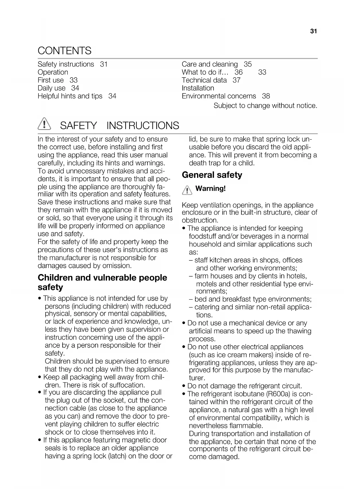 - If this appliance featuring magnetic door seals is to replace an older appliance having a spring lock (latch) on the door or lid, be sure to make that spring lock un- usable before you discard the old appli- ance. This will prevent it from becoming a death trap for a child. General safety Warning! Keep ventilation openings, in the appliance enclosure or in the built-in structure, clear of obstruction.