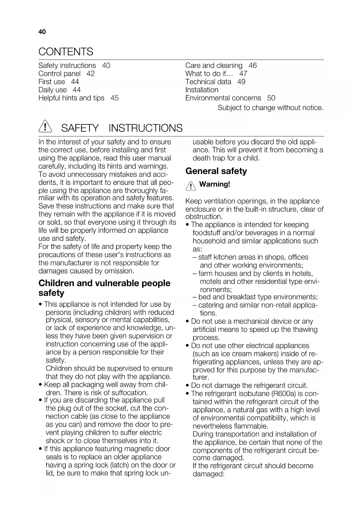 - If this appliance featuring magnetic door seals is to replace an older appliance having a spring lock (latch) on the door or lid, be sure to make that spring lock un- usable before you discard the old appli- ance. This will prevent it from becoming a death trap for a child. General safety Warning! Keep ventilation openings, in the appliance enclosure or in the built-in structure, clear of obstruction.