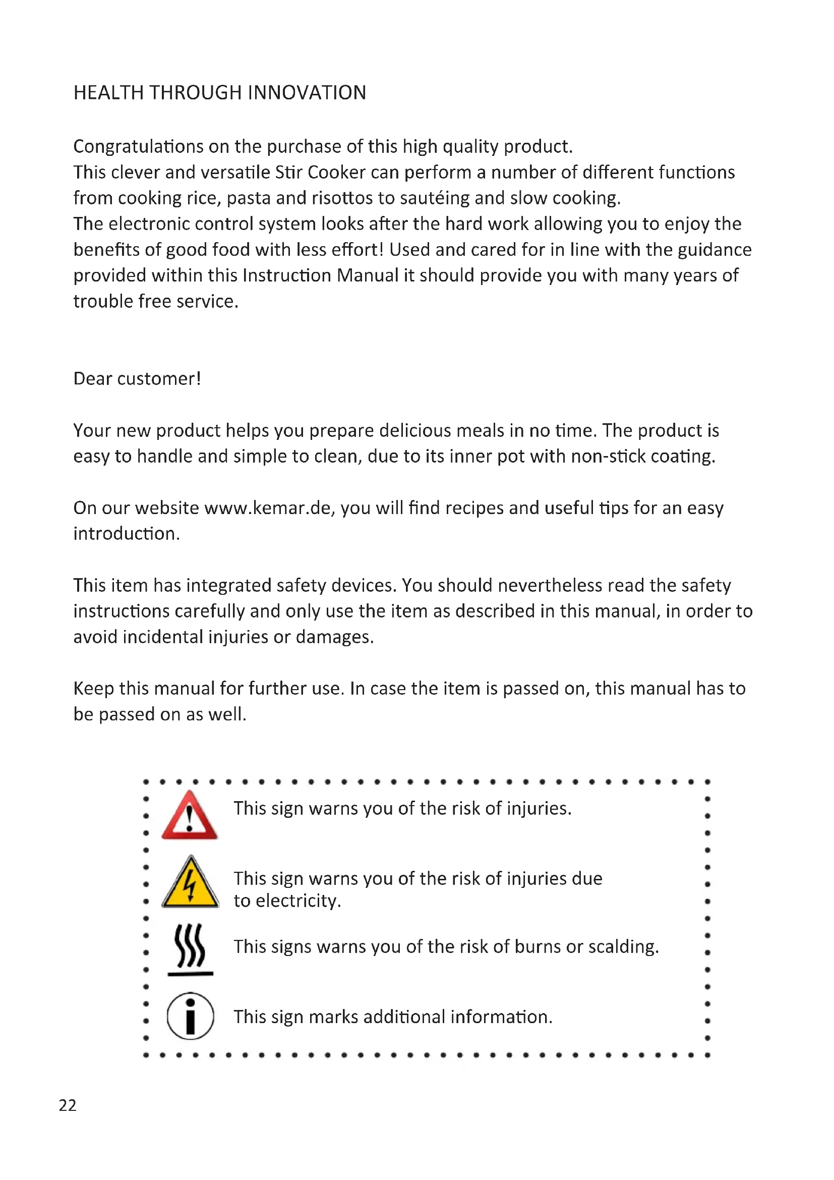 The electronic control system looks after the hard work allowing you to enjoy the benefits of good food with less effort! Used and cared for in line with the guidance provided within this Instruction Manual it should provide you with many years of trouble free service.