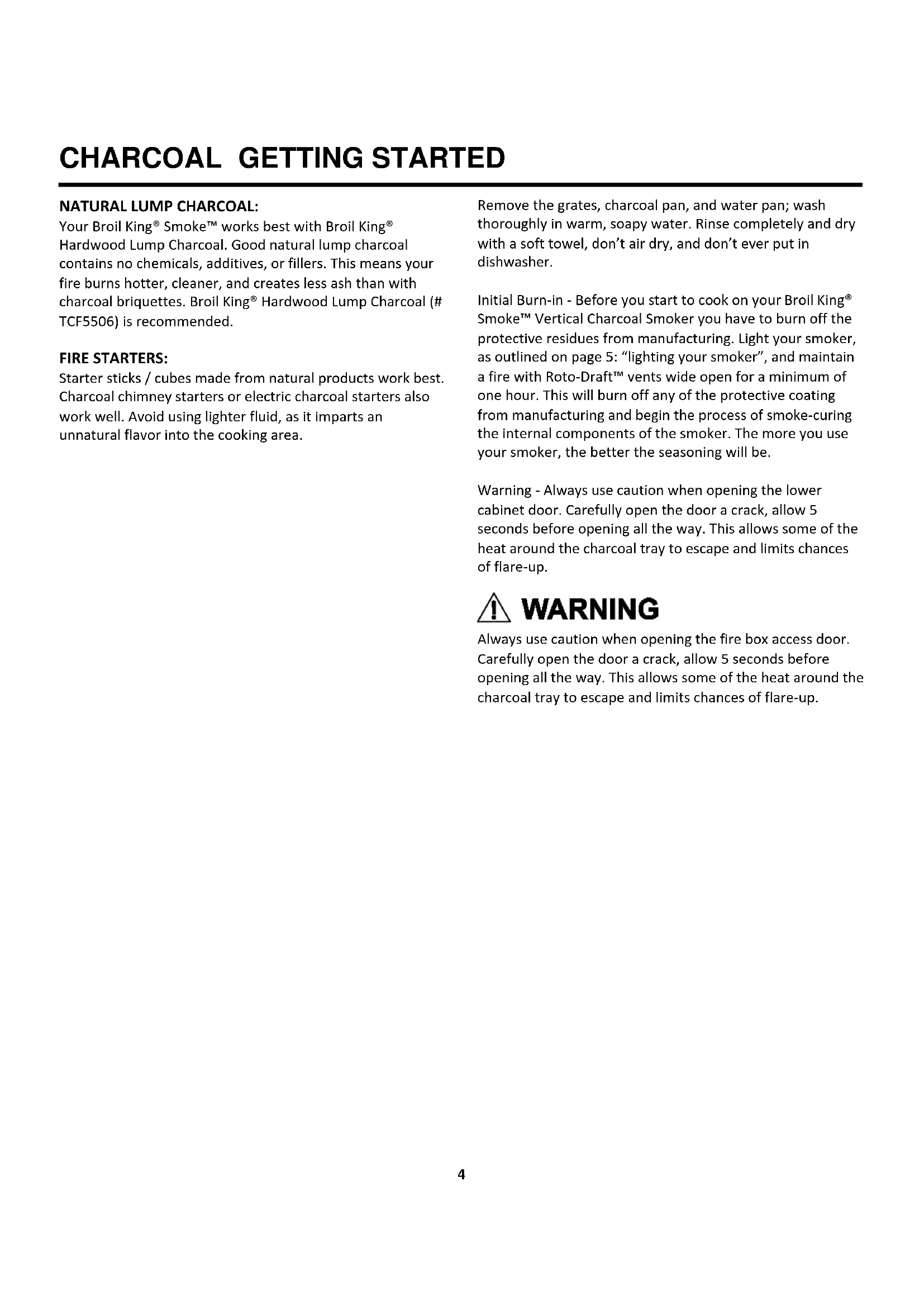 Initial Burn-in - Before you start to cook on your Broil King® Smoke™ Vertical Charcoal Smoker you have to burn off the protective residues from manufacturing. Light your smoker, as outlined on page 5: "lighting your smoker", and maintain a fire with Roto-Draft™ vents wide open for a minimum of one hour. This will burn off any of the protective coating from manufacturing and begin the process of smoke-curing the internal components of the smoker. The more you use your smoker, the better the seasoning will be.