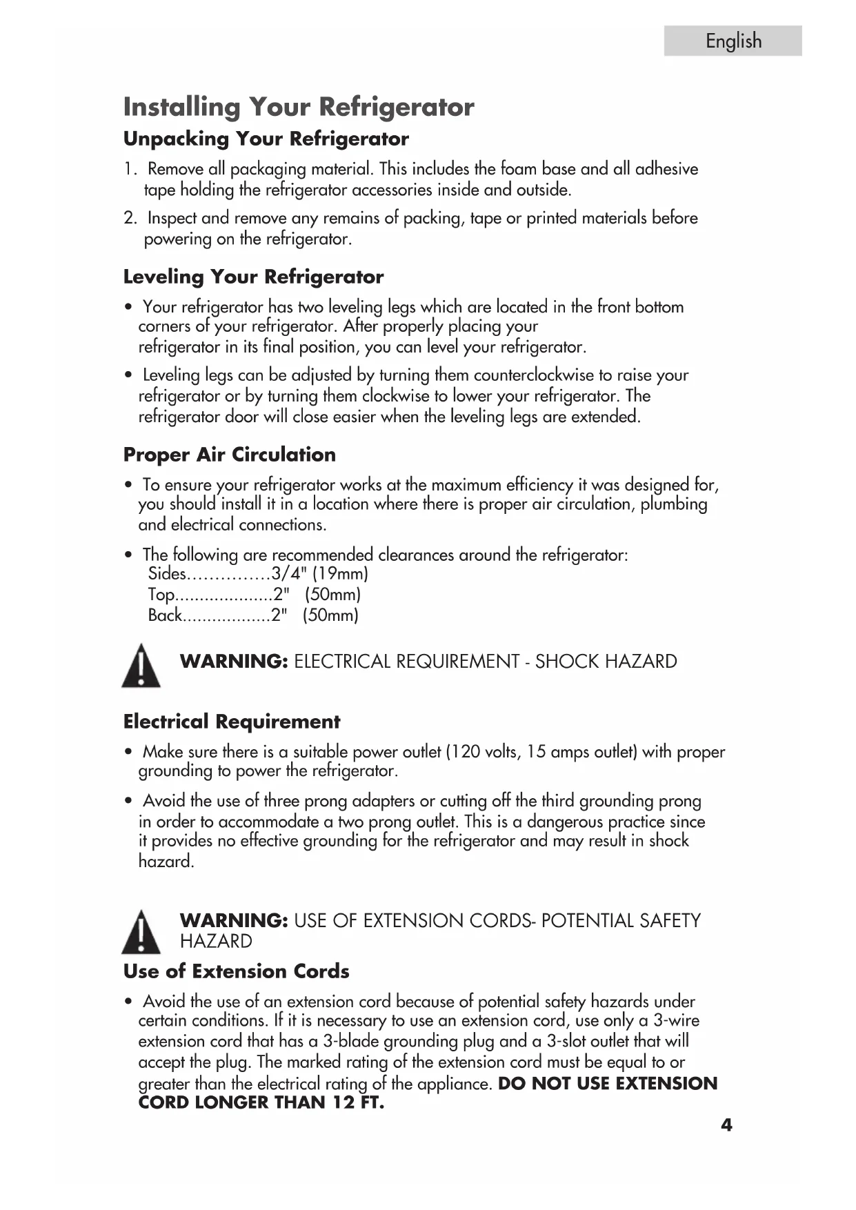 - The following are recommended clearances around the refrigerator: Sides……………3/4" (19mm) Top....................2" (50mm) Back..................2" (50mm)
