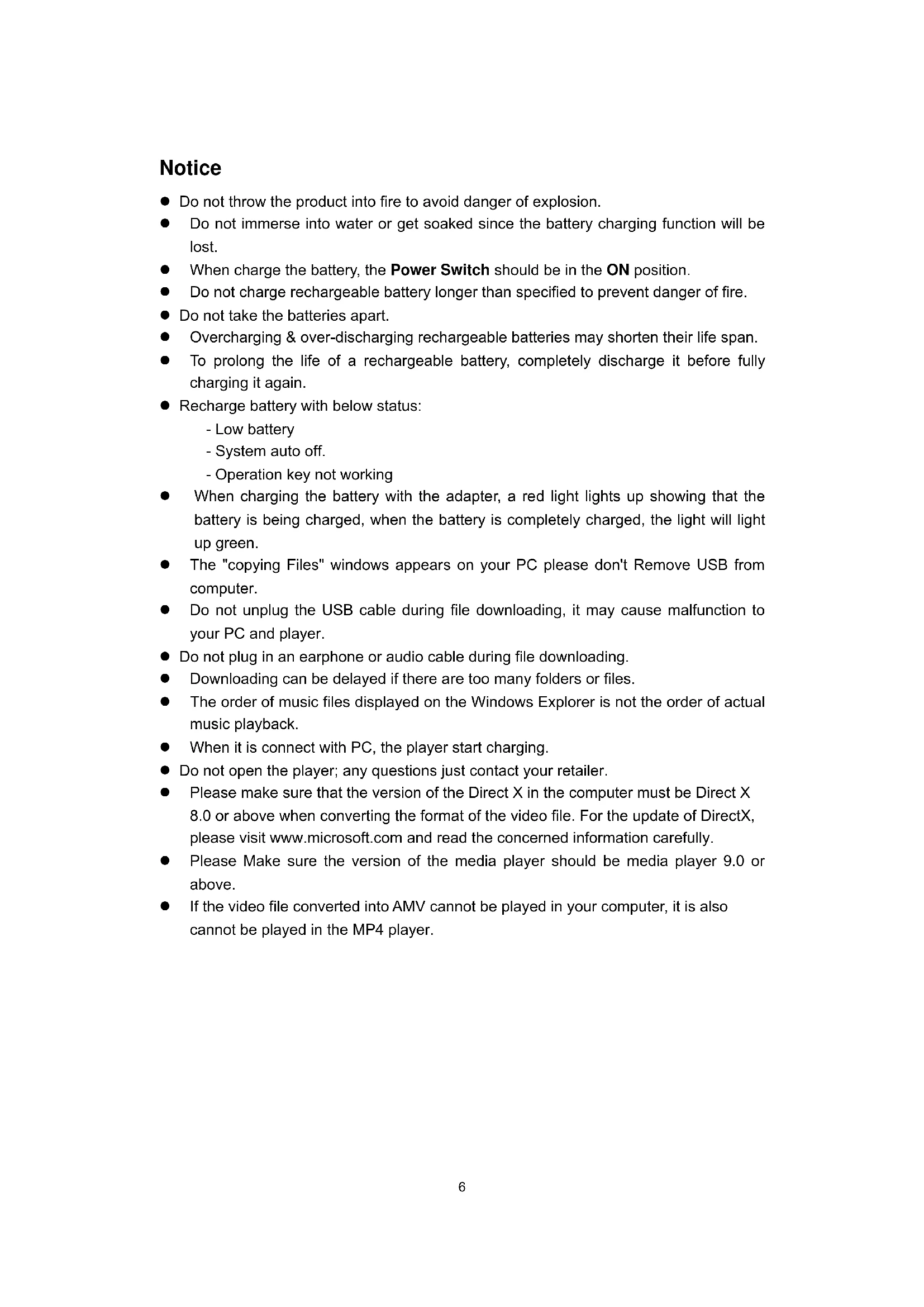 The order of music files displayed on the Windows Explorer is not the order of actual music playback. - When it is connect with PC, the player start charging.