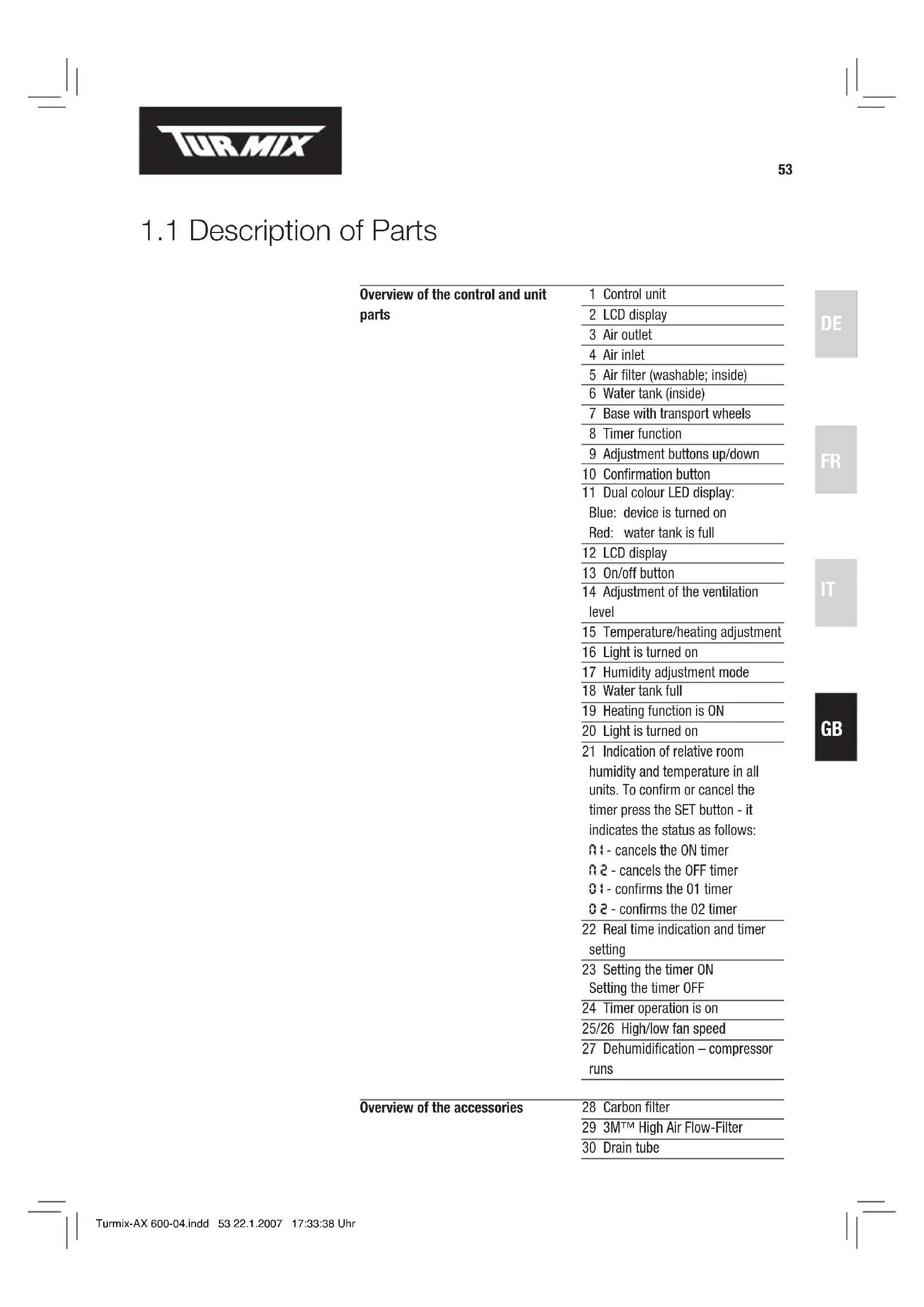 1 Control unit 2 LCD display 3 Air outlet 4 Air inlet 5 Air filter (washable; inside) 6 Water tank (inside) 7 Base with transport wheels 8 Timer function 9 Adjustment buttons up/down 10 Confirmation button 11 Dual colour LED display: Blue: device is turned on Red: water tank is full 12 LCD display 13 On/off button 14 Adjustment of the ventilation level 15 Temperature/heating adjustment 16 Light is turned on 17 Humidity adjustment mode 18 Water tank full 19 Heating function is ON 20 Light is turned on 21 Indication of relative room humidity and temperature in all units. To confirm or cancel the timer press the SET button - it indicates the status as follows: N I - cancels the ON timer N 2 - cancels the OFF timer O I - confirms the 01 timer O 2 - confirms the 02 timer 22 Real time indication and timer setting 23 Setting the timer ON Setting the timer OFF 24 Timer operation is on 25/26 High/low fan speed 27 Dehumidification – compressor runs Overview of the control and unit parts Overview of the accessories 28 Carbon filter 29 3M™ High Air Flow-Filter 30 Drain tube Turmix-AX 600-04.indd 53 22.1.2007 17:33:38 Uhr54
