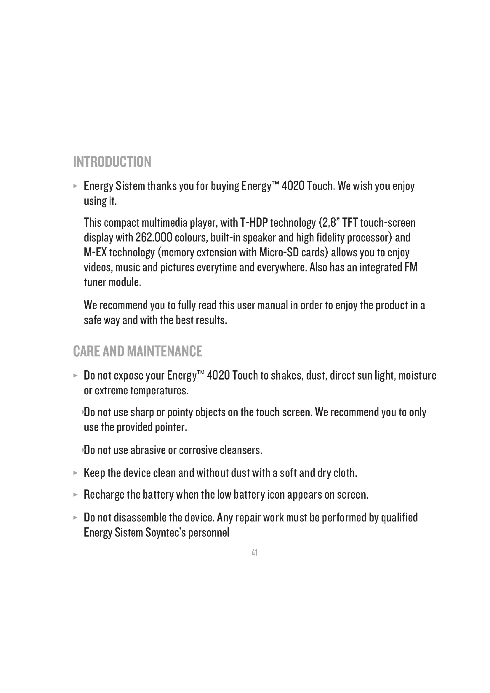 User manual4041 INTRODUCTION Energy Sistem thanks you for buying Energy™ 4020 Touch. We wish you enjoy ≥ using it. This compact multimedia player, with T-HDP technology (2,8” TFT touch-screen display with 262.000 colours, built-in speaker and high fidelity processor) and M-EX technology (memory extension with Micro-SD cards) allows you to enjoy videos, music and pictures everytime and everywhere. Also has an integrated FM tuner module. We recommend you to fully read this user manual in order to enjoy the product in a safe way and with the best results.