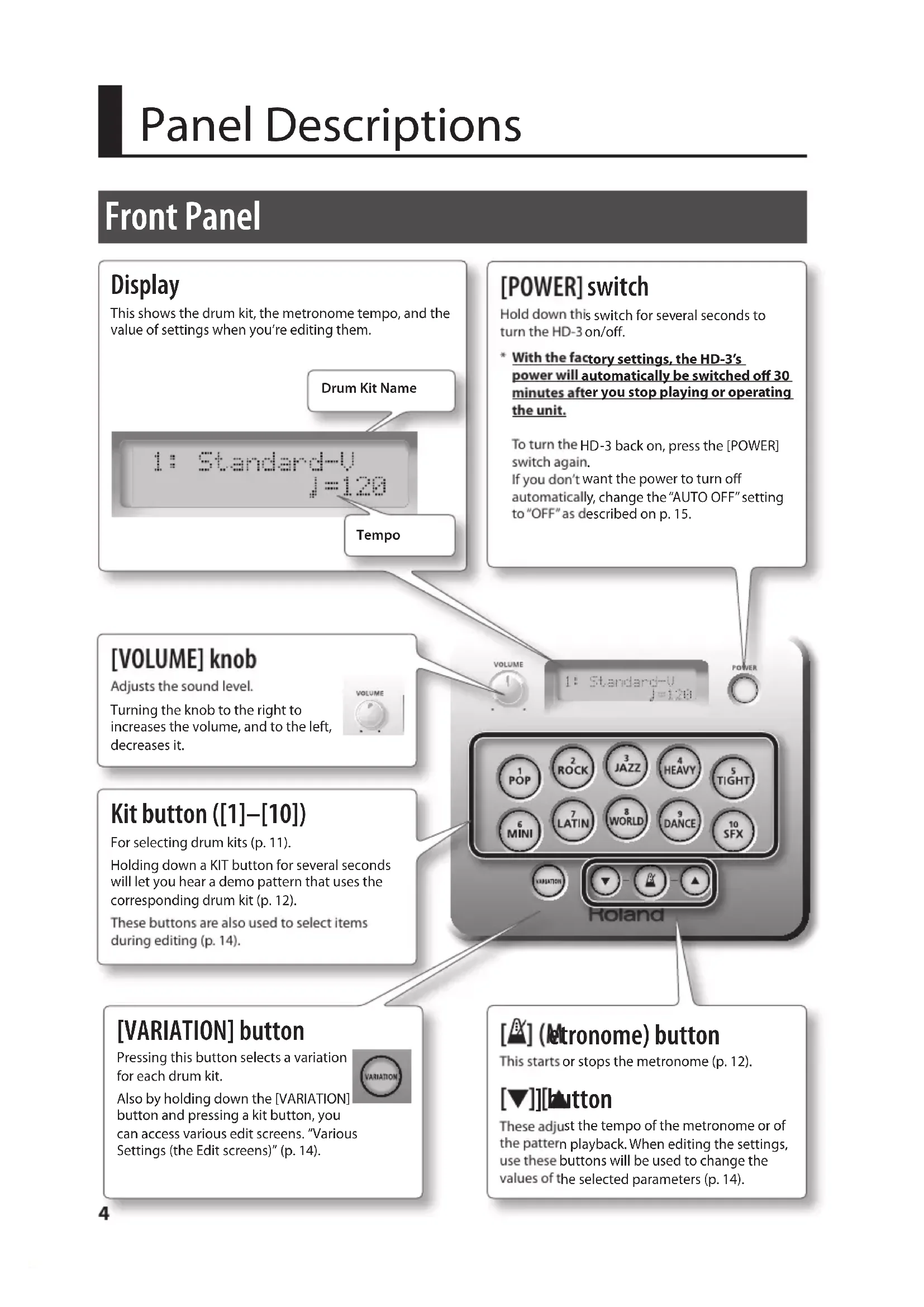 - With the factory settings, the HD-3’s power will automatically be switched o 30 minutes after you stop playing or operating the unit. To turn the HD-3 back on, press the [POWER] switch again. If you don’t want the power to turn o automatically, change the “AUTO OFF” setting to “OFF” as described on p. 15. Display This shows the drum kit, the metronome tempo, and the value of settings when you’re editing them. Drum Kit Name TempoPanel Descriptions