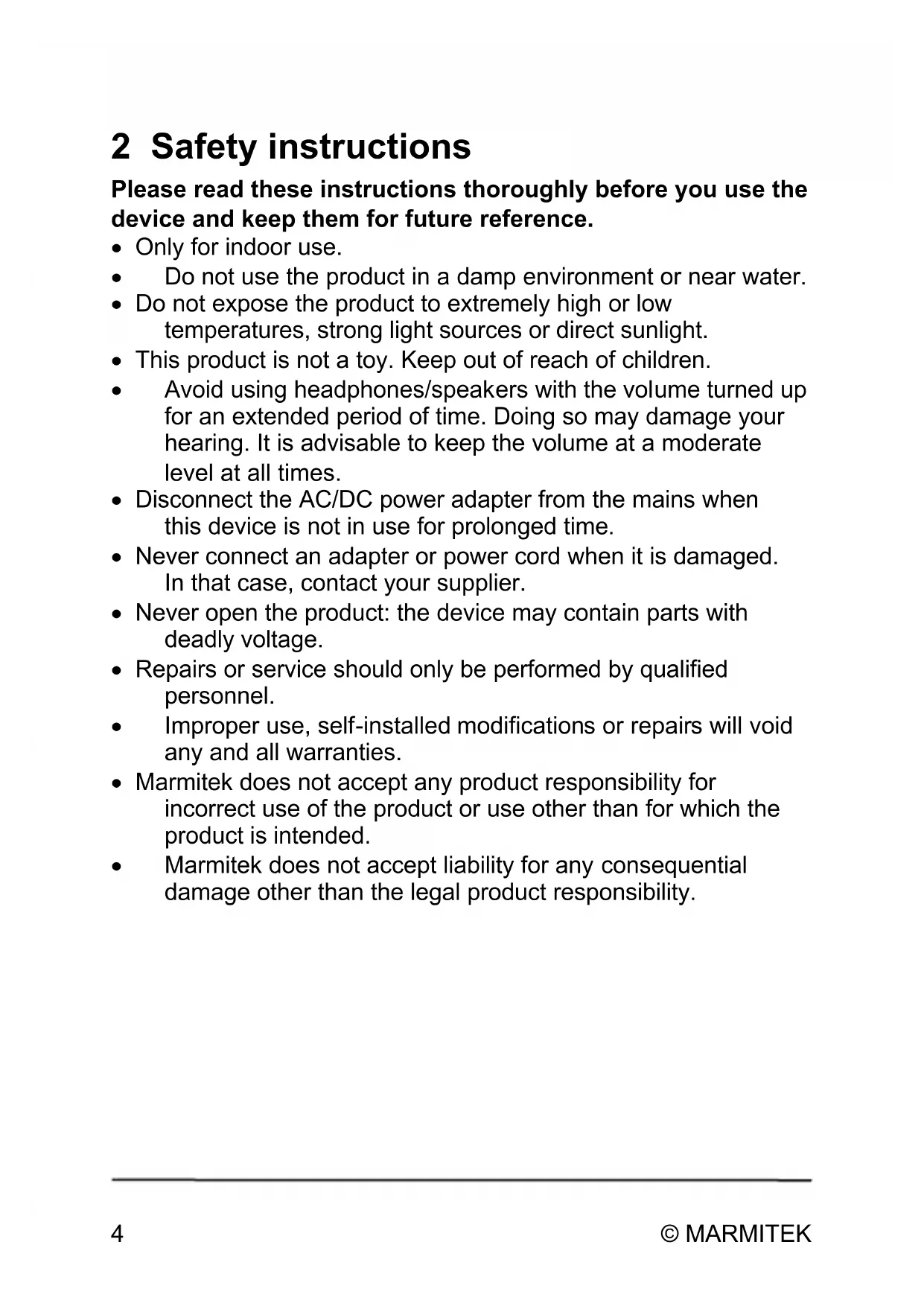 2 Safety instructions Please read these instructions thoroughly before you use the device and keep them for future reference. Only for indoor use. Do not use the product in a damp environment or near water. Do not expose the product to extremely high or low temperatures, strong light sources or direct sunlight. This product is not a toy. Keep out of reach of children. Avoid using headphones/speakers with the volume turned up for an extended period of time. Doing so may damage your hearing. It is advisable to keep the volume at a moderate level at all times. Disconnect the AC/DC power adapter from the mains when this device is not in use for prolonged time. Never connect an adapter or power cord when it is damaged. In that case, contact your supplier. Never open the product: the device may contain parts with deadly voltage. Repairs or service should only be performed by qualified personnel. Improper use, self-installed modifications or repairs will void any and all warranties. Marmitek does not accept any product responsibility for incorrect use of the product or use other than for which the product is intended. Marmitek does not accept liability for any consequential damage other than the legal product responsibility.Subwoofer Anywhere 635