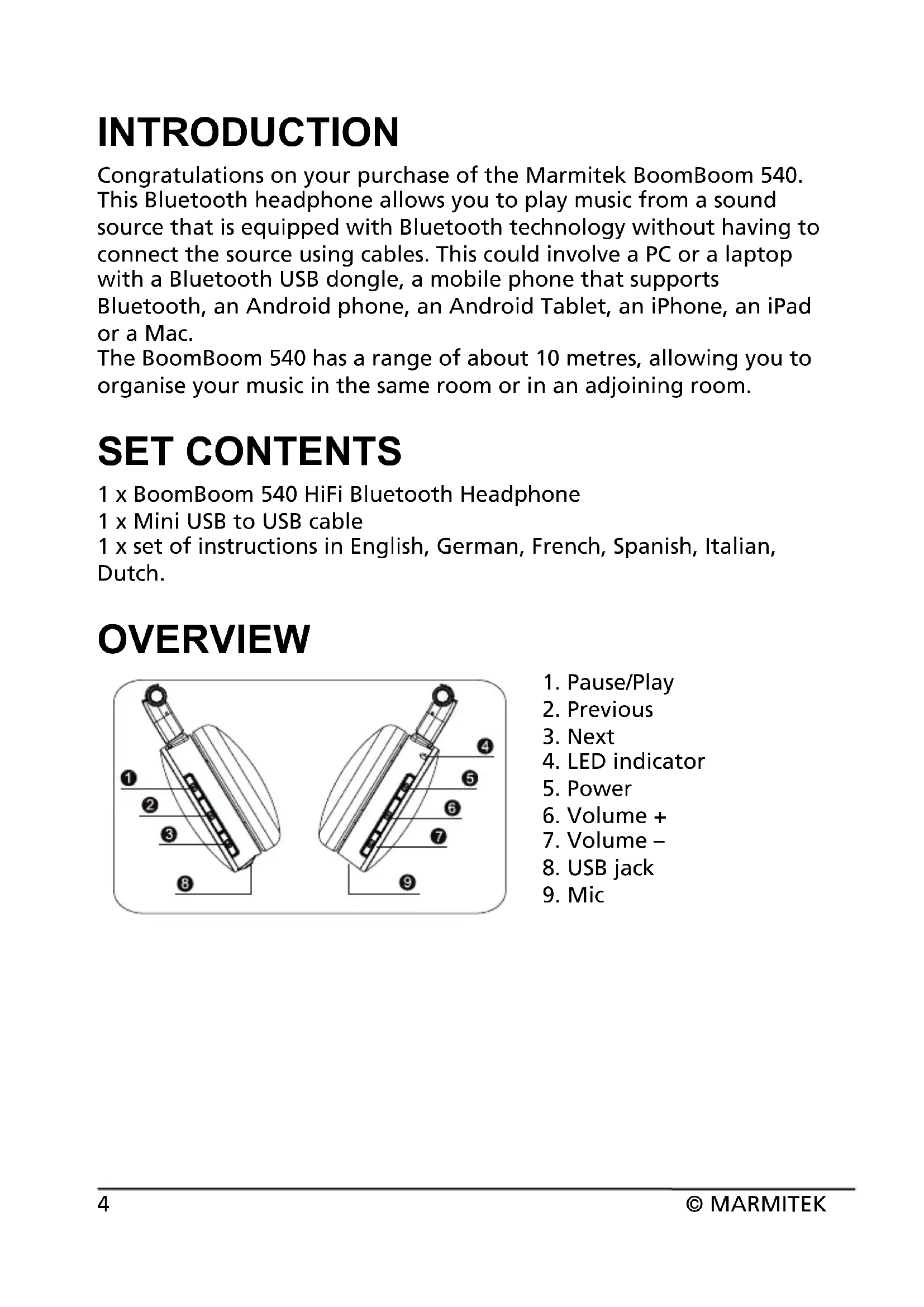 Congratulations on your purchase of the Marmitek BoomBoom 540. This Bluetooth headphone allows you to play music from a sound source that is equipped with Bluetooth technology without having to connect the source using cables. This could involve a PC or a laptop with a Bluetooth USB dongle, a mobile phone that supports Bluetooth, an Android phone, an Android Tablet, an iPhone, an iPad or a Mac. The BoomBoom 540 has a range of about 10 metres, allowing you to organise your music in the same room or in an adjoining room. SET CONTENTS 1 x BoomBoom 540 HiFi Bluetooth Headphone 1 x Mini USB to USB cable 1 x set of instructions in English, German, French, Spanish, Italian, Dutch. OVERVIEW