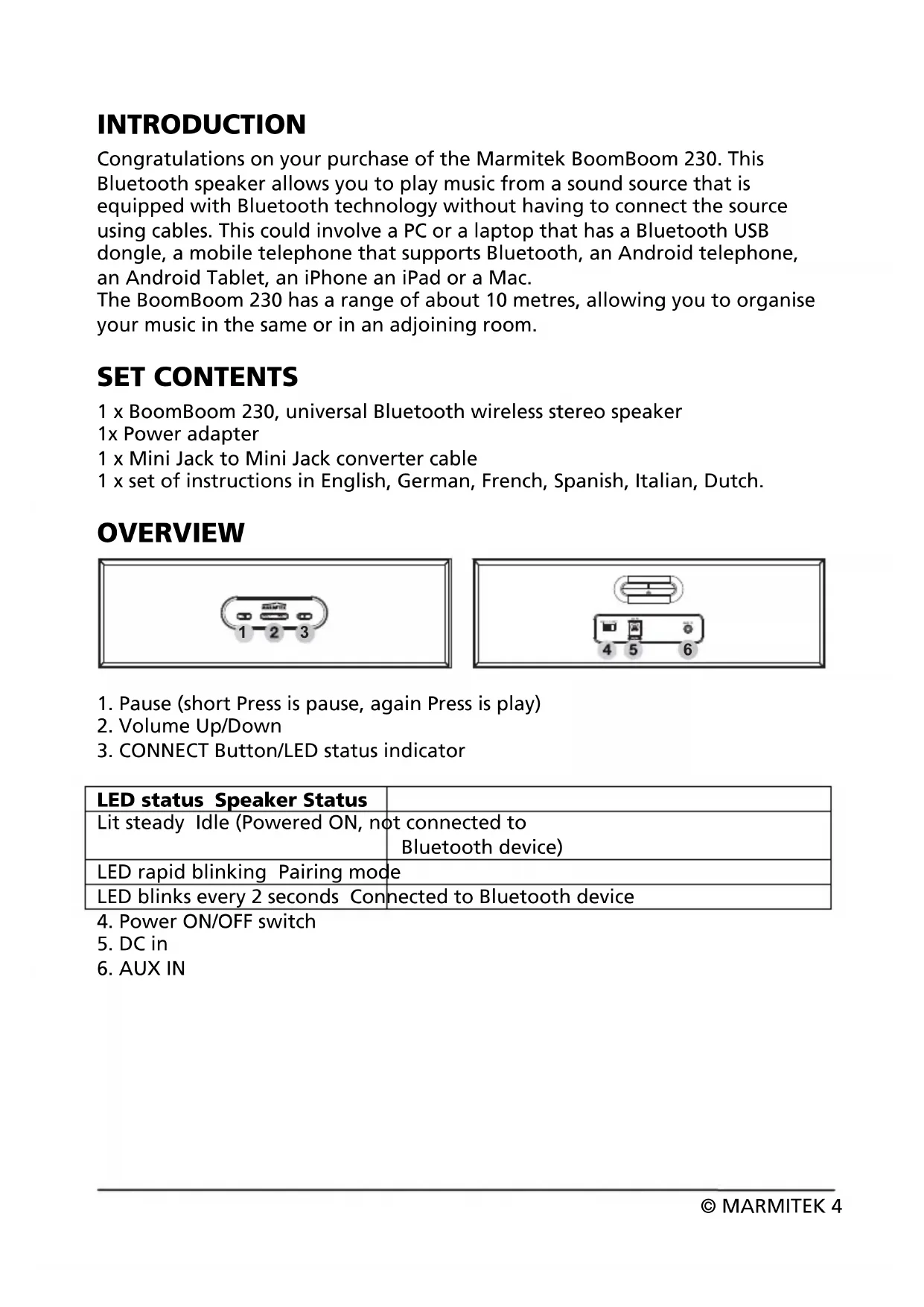 COPYRIGHTS ............................................................................................................7INTRODUCTION Congratulations on your purchase of the Marmitek BoomBoom 230. This Bluetooth speaker allows you to play music from a sound source that is equipped with Bluetooth technology without having to connect the source using cables. This could involve a PC or a laptop that has a Bluetooth USB dongle, a mobile telephone that supports Bluetooth, an Android telephone, an Android Tablet, an iPhone an iPad or a Mac. The BoomBoom 230 has a range of about 10 metres, allowing you to organise your music in the same or in an adjoining room. SET CONTENTS 1 x BoomBoom 230, universal Bluetooth wireless stereo speaker 1x Power adapter 1 x Mini Jack to Mini Jack converter cable 1 x set of instructions in English, German, French, Spanish, Italian, Dutch. OVERVIEW