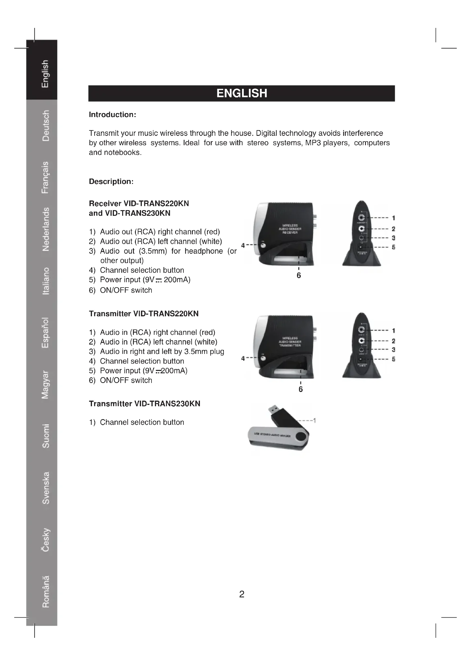 VID-TRANS220KN VID-TRANS230KN2 ENGLISH Introduction: Transmit your music wireless through the house. Digital technology avoids interference by other wireless systems. Ideal for use with stereo systems, MP3 players, computers and notebooks. Description: Receiver VID-TRANS220KN and VID-TRANS230KN