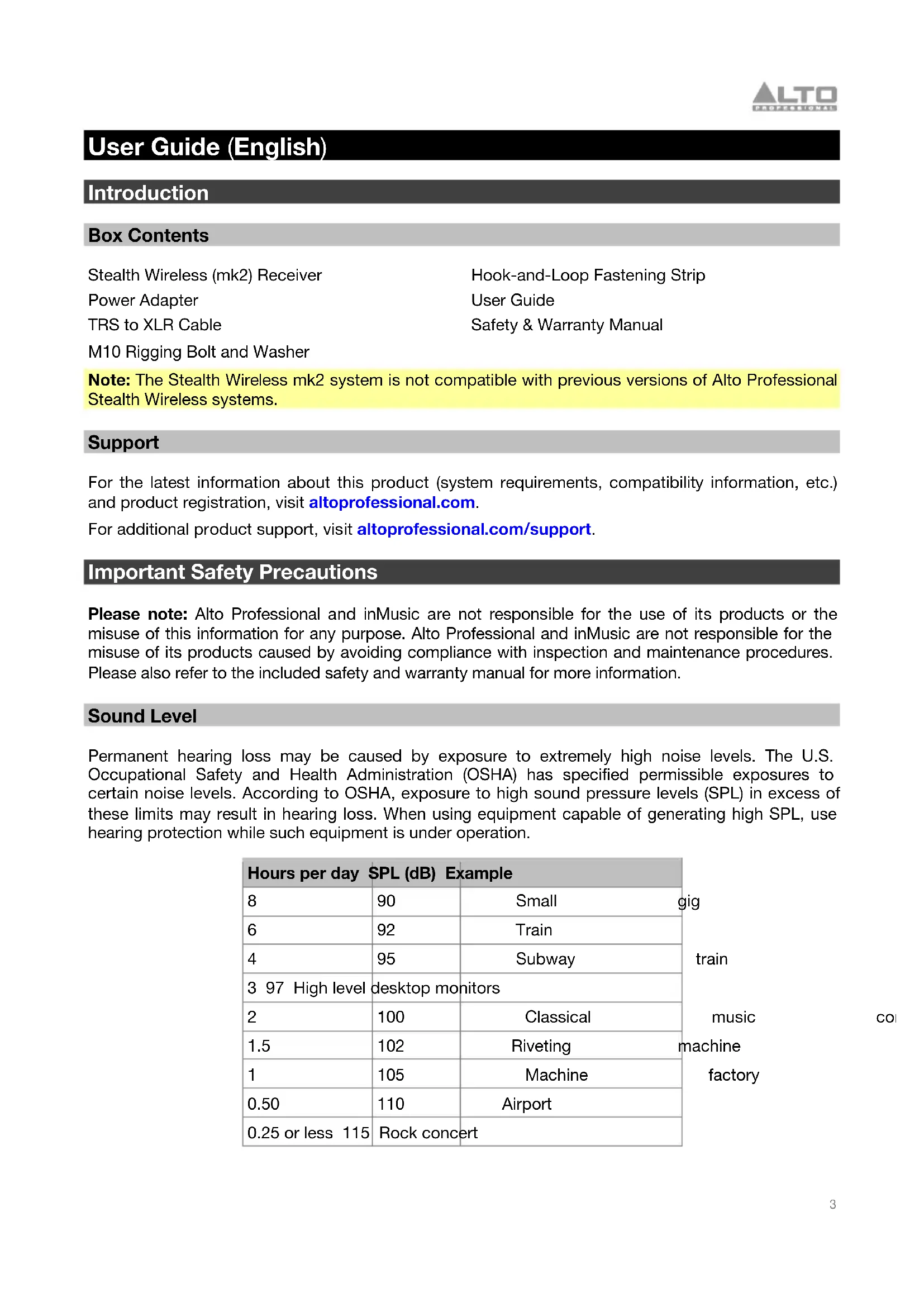 User Guide (English) Introduction Box Contents Stealth Wireless (mk2) Receiver Power Adapter TRS to XLR Cable M10 Rigging Bolt and Washer Hook-and-Loop Fastening Strip User Guide Safety & Warranty Manual Note: The Stealth Wireless mk2 system is not compatible with previous versions of Alto Professional Stealth Wireless systems. Support For the latest information about this product (system requirements, compatibility information, etc.) and product registration, visit altoprofessional.com. For additional product support, visit altoprofessional.com/support. Important Safety Precautions Please note: Alto Professional and inMusic are not responsible for the use of its products or the misuse of this information for any purpose. Alto Professional and inMusic are not responsible for the misuse of its products caused by avoiding compliance with inspection and maintenance procedures. Please also refer to the included safety and warranty manual for more information. Sound Level Permanent hearing loss may be caused by exposure to extremely high noise levels. The U.S. Occupational Safety and Health Administration (OSHA) has specified permissible exposures to certain noise levels. According to OSHA, exposure to high sound pressure levels (SPL) in excess of these limits may result in hearing loss. When using equipment capable of generating high SPL, use hearing protection while such equipment is under operation. Hours per day SPL (dB) Example 8 90 Small gig 6 92 Train 4 95 Subway train 3 97 High level desktop monitors 2 100 Classical music concert