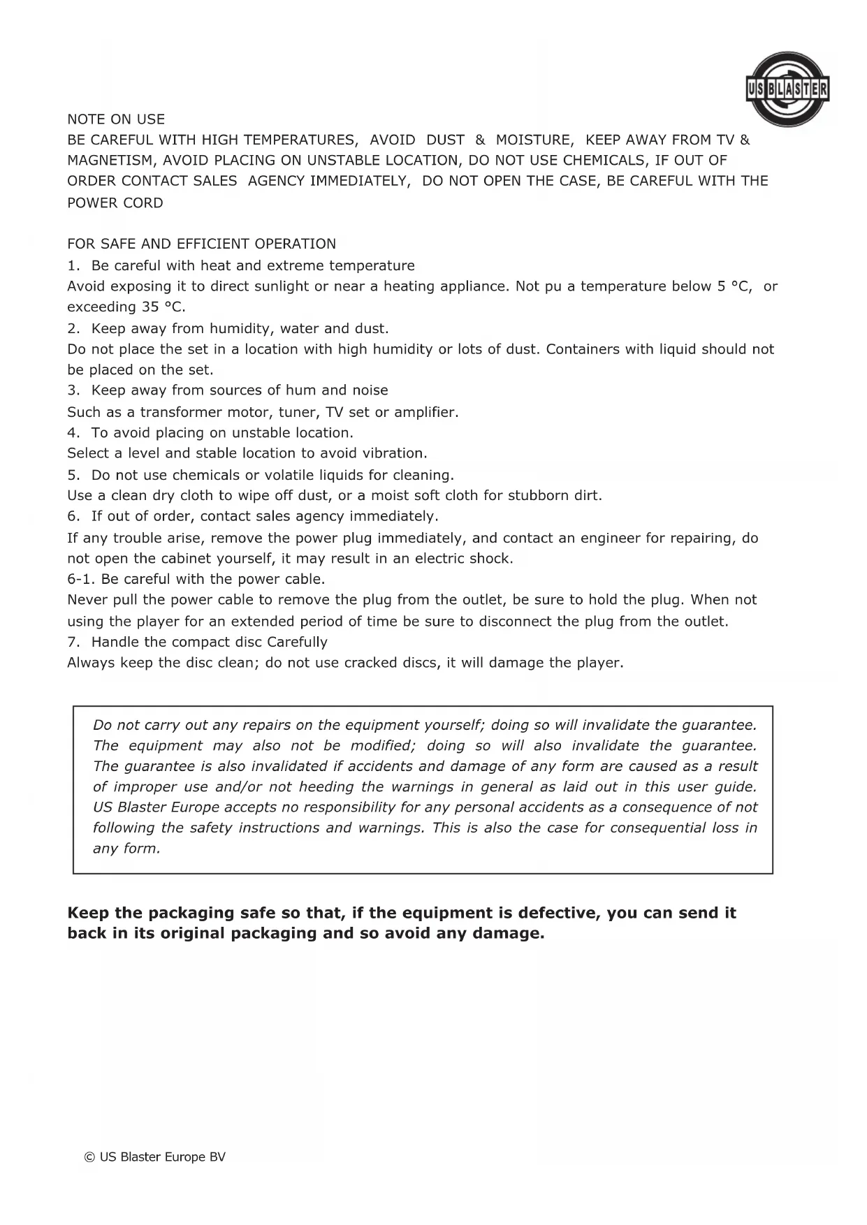 Always keep the disc clean; do not use cracked discs, it will damage the player. Keep the packaging safe so that, if the equipment is defective, you can send it back in its original packaging and so avoid any damage. © US Blaster Europe BV Do not carry out any repairs on the equipment yourself; doing so will invalidate the guarantee. The equipment may also not be modified; doing so will also invalidate the guarantee. The guarantee is also invalidated if accidents and damage of any form are caused as a result of improper use and/or not heeding the warnings in general as laid out in this user guide. US Blaster Europe accepts no responsibility for any personal accidents as a consequence of not following the safety instructions and warnings. This is also the case for consequential loss in any form.© US Blaster Europe BV© US Blaster Europe BV© US Blaster Europe BVFONCTIONNEMENT FAITES ATTENTION AUX TEMPERATURES ELEVEES, ÉVITEZ LES POUSSIÈRES & L'HUMIDITÉ, GARDEZ À DISTANCE DES TELEVISIONS & DES MAGNETISMES, ÉVITEZ DE PLACER L'UNITÉ À UN EMPLACEMENT INSTABLE, N’UTILISEZ PAS DE PRODUITS CHIMIQUES, SI L'UNITÉ TOMBE EN PANNE, CONTACTEZ IMMÉDIATEMENT LE VENDEUR, N’OUVREZ PAS LE BOITIER, PRENEZ SOIN DU CORDON D'ALIMENTATION