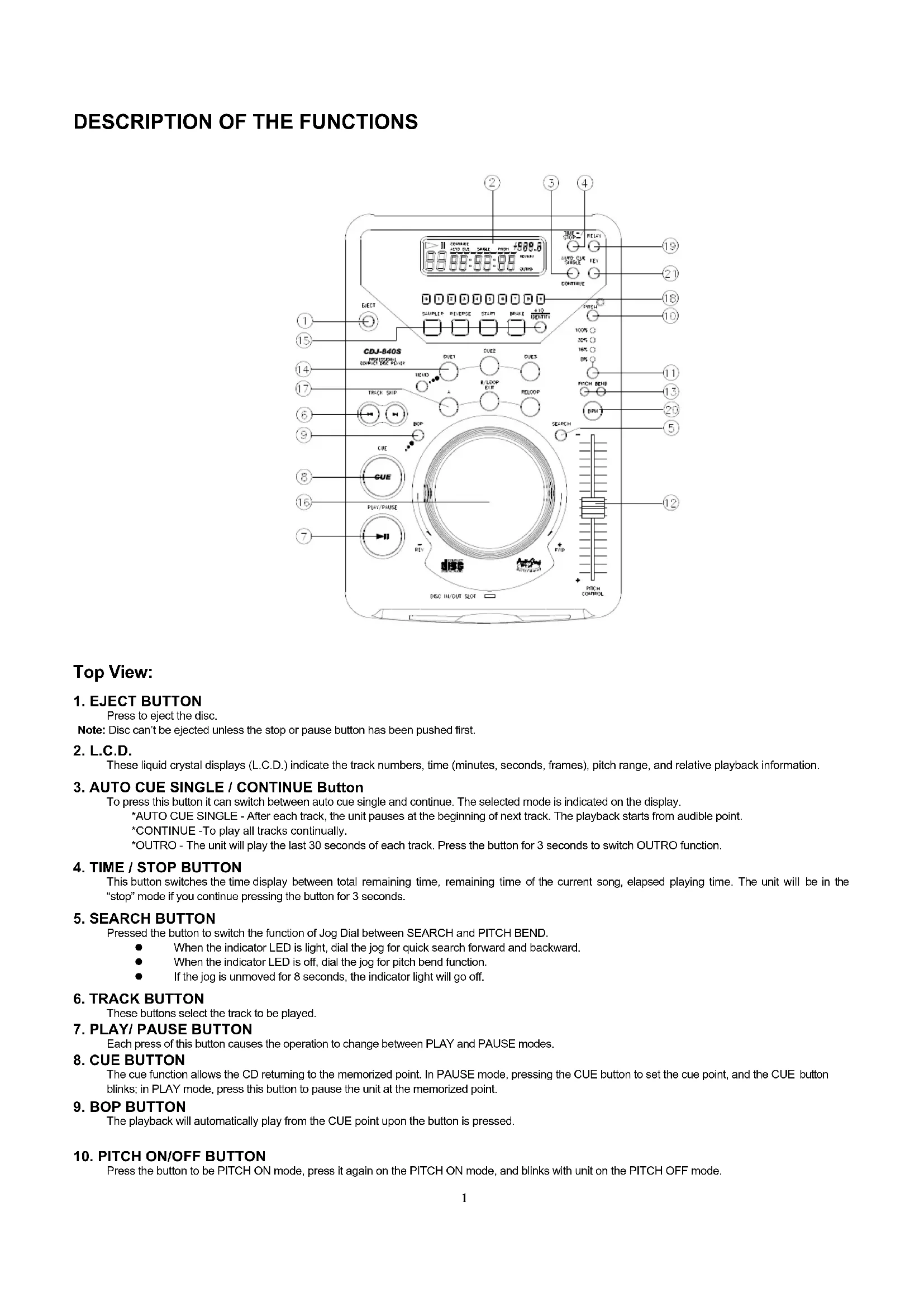The cue function allows the CD returning to the memorized point. In PAUSE mode, pressing the CUE button to set the cue point, and the CUE button blinks; in PLAY mode, press this button to pause the unit at the memorized point.