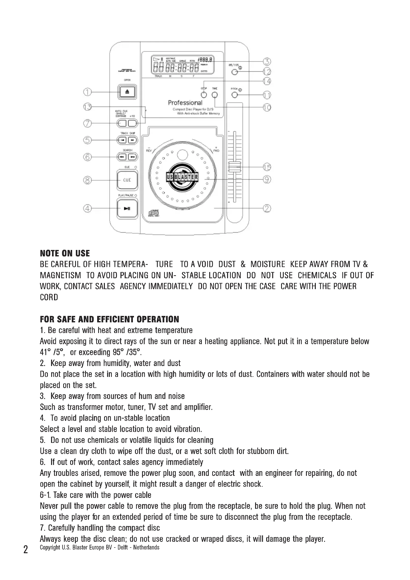 COMPACT DIS Player for DJS With Anti-shock Buffer Memory Professional Compact Disc Player for DJS with Anti-shock Buffer Memory OPEN AUTO CUE SHRUE/ CONTINUE +10 TRACK SKIP SEARCH DUE CUE PLAY/PAUSE REV + FWD USB BLASTER 3 12 14 11 10 15 9 2 150NOTE ON USE