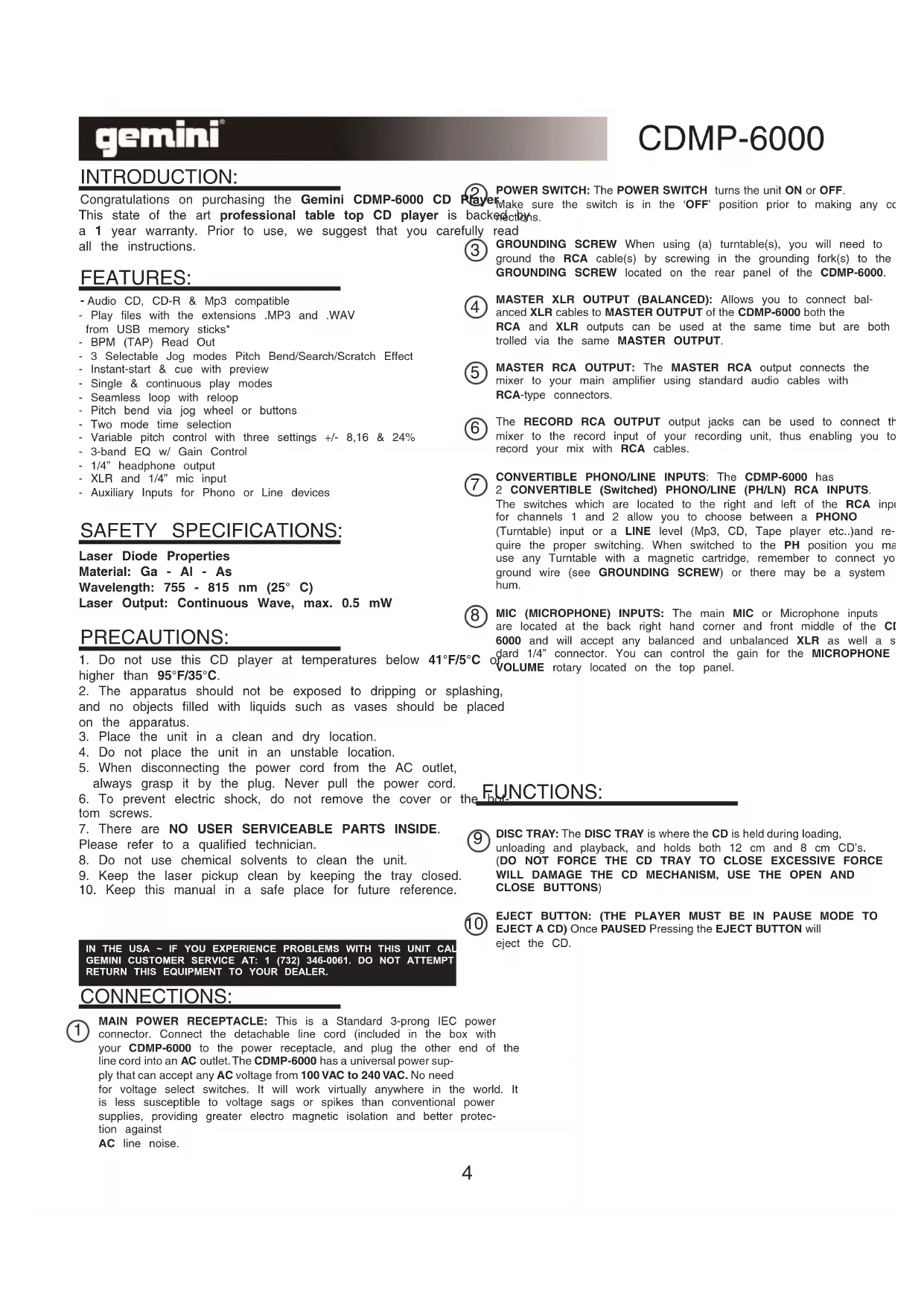 AMBAS PARTES TIENEN LAS MISMAS FUNCIONESLES 2 COTES POSSEDENT LES MEMES FONCTIONSDERSELBE ALS ANDERE SEITE FRONT PANEL FRONTAL FACE AVANT VORNE BACK PANEL TRASERO FACE ARRIERE RÜCKSEITE TOP SECCION SUPERIOR PARTIE SUPERIEURE OBENPOWER SWITCH: The POWER SWITCH turns the unit ON or OFF. Make sure the switch is in the ‘OFF’ position prior to making any con- nections. GROUNDING SCREW When using (a) turntable(s), you will need to ground the RCA cable(s) by screwing in the grounding fork(s) to the GROUNDING SCREW located on the rear panel of the CDMP-6000. MASTER XLR OUTPUT (BALANCED): Allows you to connect bal- anced XLR cables to MASTER OUTPUT of the CDMP-6000 both the RCA and XLR outputs can be used at the same time but are both con- trolled via the same MASTER OUTPUT. MASTER RCA OUTPUT: The MASTER RCA output connects the mixer to your main amplifier using standard audio cables with RCA-type connectors. The RECORD RCA OUTPUT output jacks can be used to connect the mixer to the record input of your recording unit, thus enabling you to record your mix with RCA cables. CONVERTIBLE PHONO/LINE INPUTS: The CDMP-6000 has 2 CONVERTIBLE (Switched) PHONO/LINE (PH/LN) RCA INPUTS. The switches which are located to the right and left of the RCA inputs for channels 1 and 2 allow you to choose between a PHONO (Turntable) input or a LINE level (Mp3, CD, Tape player etc..)and re- quire the proper switching. When switched to the PH position you may use any Turntable with a magnetic cartridge, remember to connect your ground wire (see GROUNDING SCREW) or there may be a system hum. MIC (MICROPHONE) INPUTS: The main MIC or Microphone inputs are located at the back right hand corner and front middle of the CDMP- 6000 and will accept any balanced and unbalanced XLR as well a stan- dard 1/4” connector. You can control the gain for the MICROPHONE VOLUME rotary located on the top panel. FUNCTIONS: DISC TRAY: The DISC TRAY is where the CD is held during loading, unloading and playback, and holds both 12 cm and 8 cm CD’s. (DO NOT FORCE THE CD TRAY TO CLOSE EXCESSIVE FORCE WILL DAMAGE THE CD MECHANISM, USE THE OPEN AND CLOSE BUTTONS) EJECT BUTTON: (THE PLAYER MUST BE IN PAUSE MODE TO EJECT A CD) Once PAUSED Pressing the EJECT BUTTON will eject the CD. INTRODUCTION: FEATURES: SAFETY SPECIFICATIONS: PRECAUTIONS: CONNECTIONS: MAIN POWER RECEPTACLE: This is a Standard 3-prong IEC power connector. Connect the detachable line cord (included in the box with your CDMP-6000 to the power receptacle, and plug the other end of the line cord into an AC outlet. The CDMP-6000 has a universal power sup- ply that can accept any AC voltage from 100 VAC to 240 VAC. No need for voltage select switches. It will work virtually anywhere in the world. It is less susceptible to voltage sags or spikes than conventional power supplies, providing greater electro magnetic isolation and better protec- tion against AC line noise. IN THE USA ~ IF YOU EXPERIENCE PROBLEMS WITH THIS UNIT CALLGEMINI CUSTOMER SERVICE AT: 1 (732) 346-0061. DO NOT ATTEMPT TORETURN THIS EQUIPMENT TO YOUR DEALER. Congratulations on purchasing the Gemini CDMP-6000 CD Player. This state of the art professional table top CD player is backed by a 1 year warranty. Prior to use, we suggest that you carefully read all the instructions.