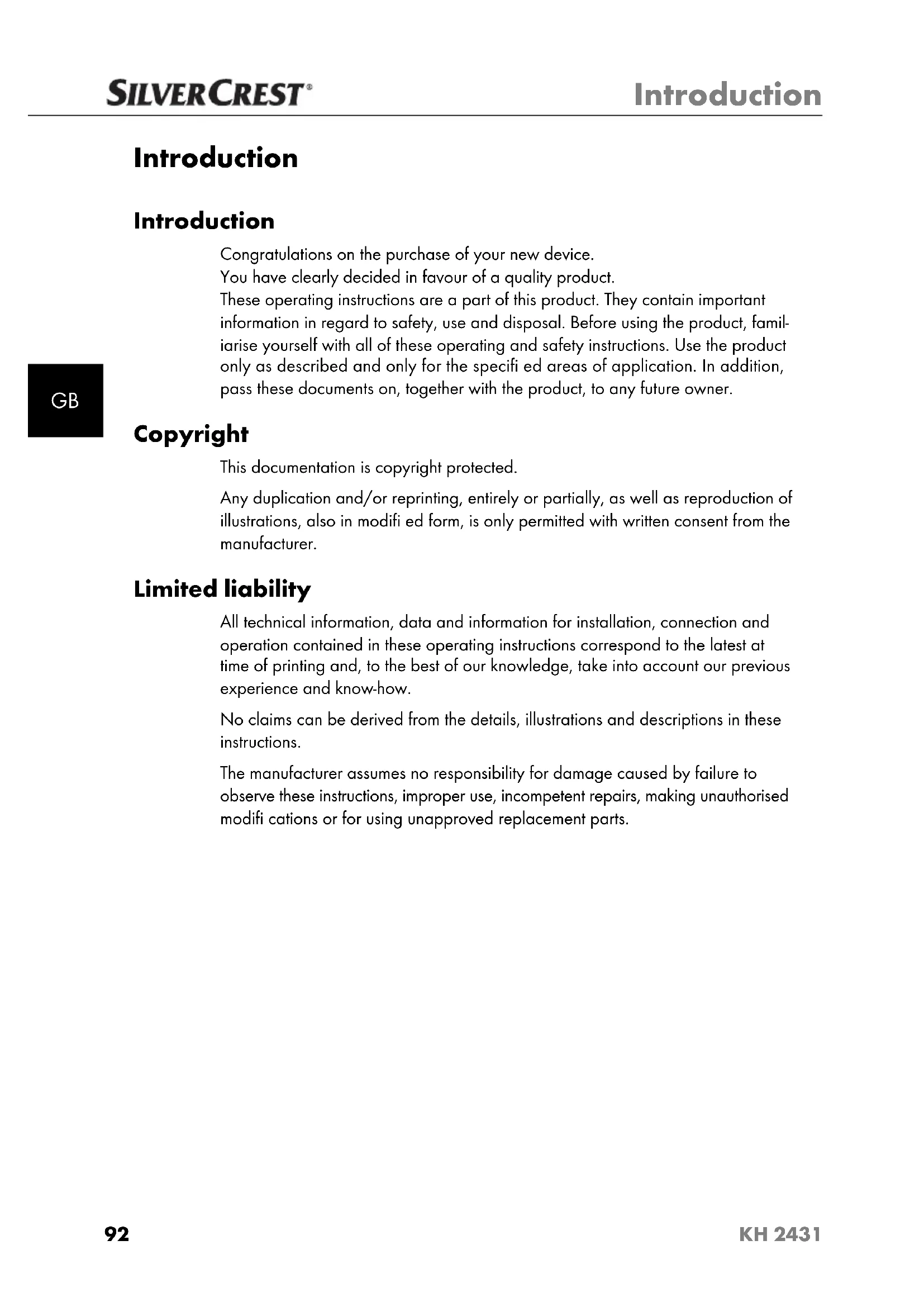 Introduction Introduction Congratulations on the purchase of your new device. You have clearly decided in favour of a quality product. These operating instructions are a part of this product. They contain important information in regard to safety, use and disposal. Before using the product, famil-iarise yourself with all of these operating and safety instructions. Use the product only as described and only for the specifi ed areas of application. In addition, pass these documents on, together with the product, to any future owner. Copyright This documentation is copyright protected.Any duplication and/or reprinting, entirely or partially, as well as reproduction of illustrations, also in modifi ed form, is only permitted with written consent from the manufacturer. Limited liability All technical information, data and information for installation, connection and operation contained in these operating instructions correspond to the latest at time of printing and, to the best of our knowledge, take into account our previous experience and know-how.No claims can be derived from the details, illustrations and descriptions in these instructions.The manufacturer assumes no responsibility for damage caused by failure to observe these instructions, improper use, incompetent repairs, making unauthorised modifi cations or for using unapproved replacement parts. Buch_53140_LB2.indb 92 05.04.12 12:2293 Introduction KH 2431