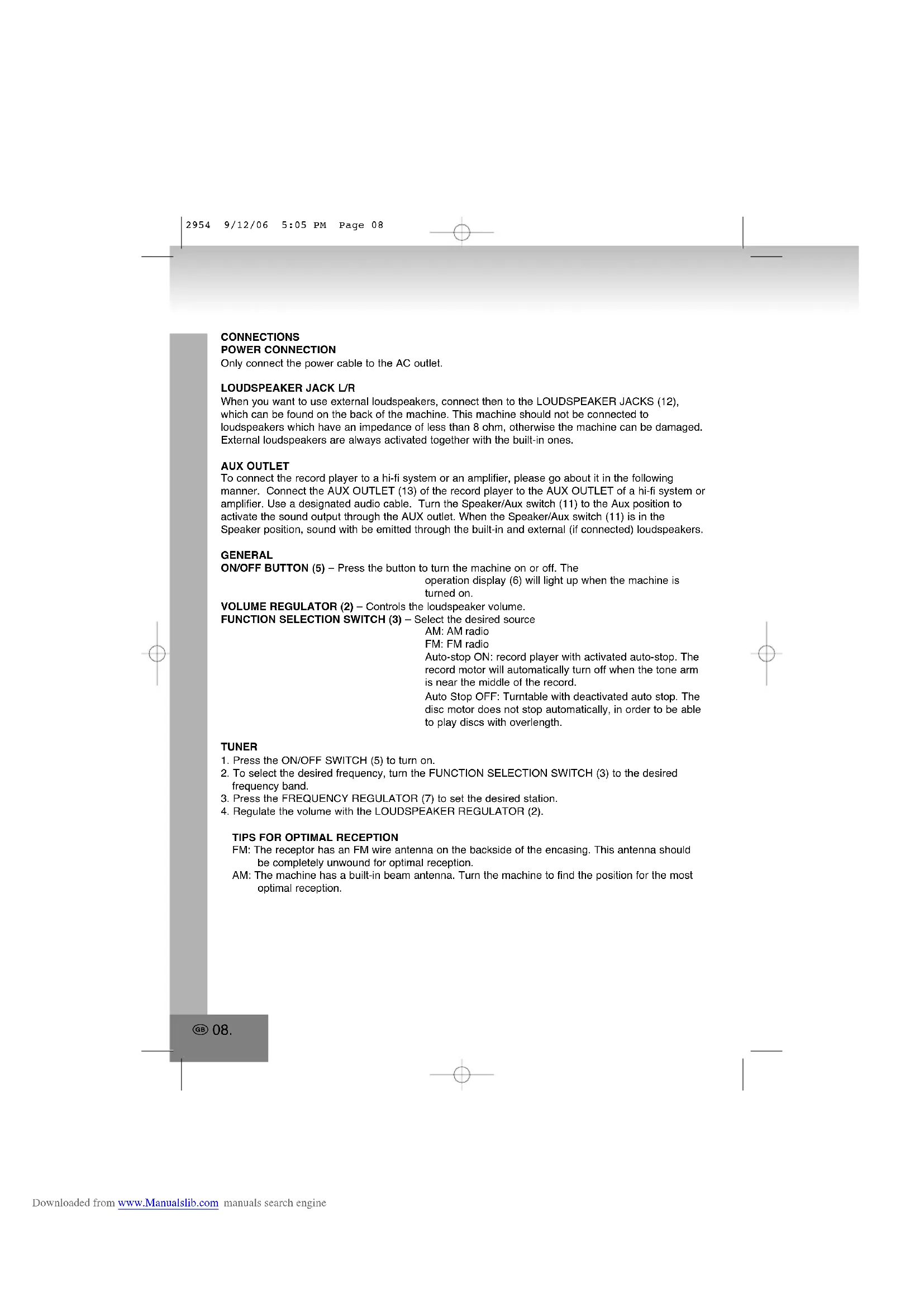 2954 9/12/06 5:05 PM Page 08 Downloaded from www.Manualslib.com manuals search enginePHONO Note: Remove the protective cap of the stylus. Before operating, make sure that the tone arm is unlocked on the tone arm holder. Lock the tone arm once again after the playing process.
