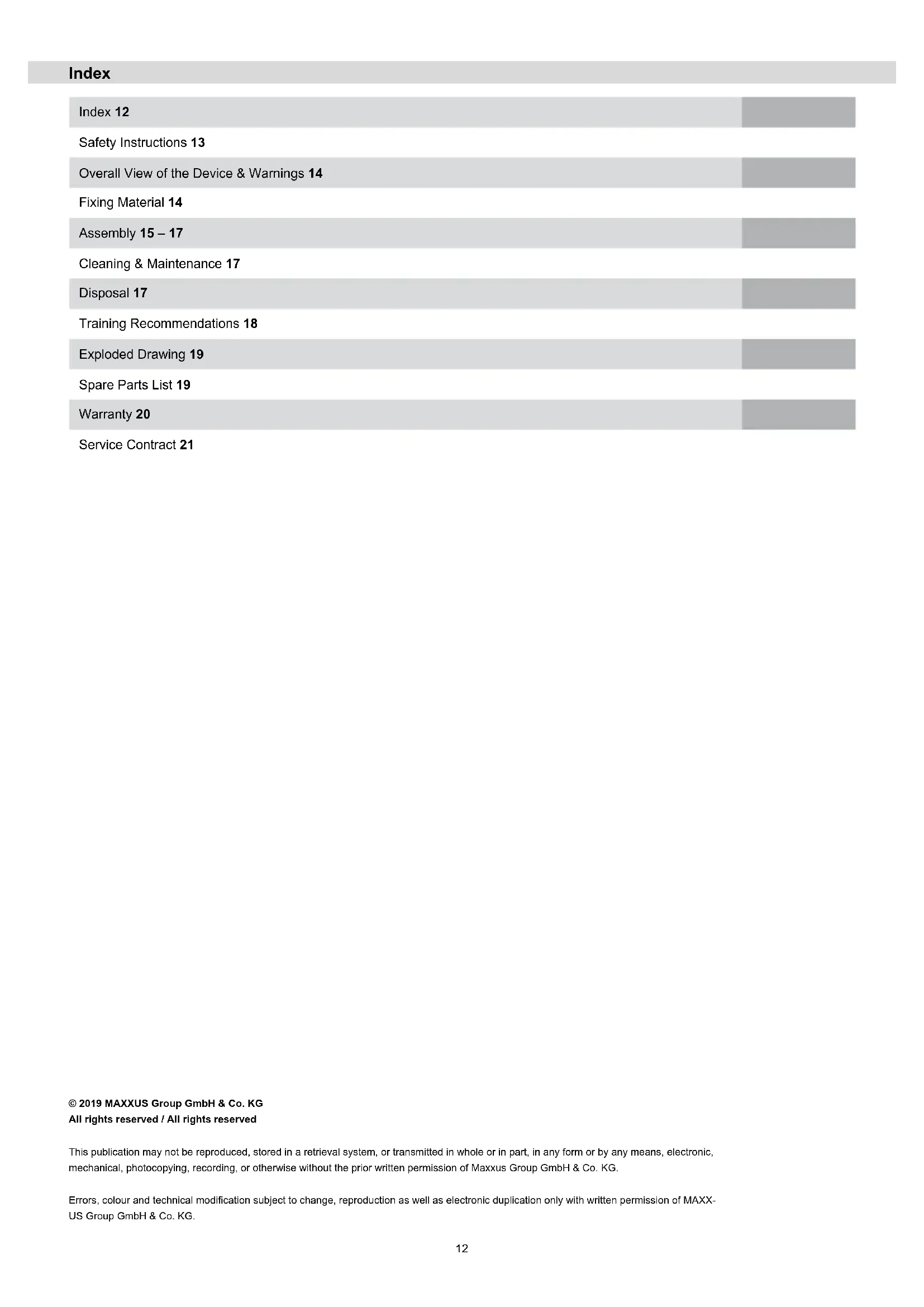 This publication may not be reproduced, stored in retrieval system, or transmitted on whole or in part, in any form or by any means, electronic, mechanical, photocopying, recording, or otherwise, without the prior written permission of MAXXUS Group GmbH & Co. KG. Technical and or color modifications and errors excepted.