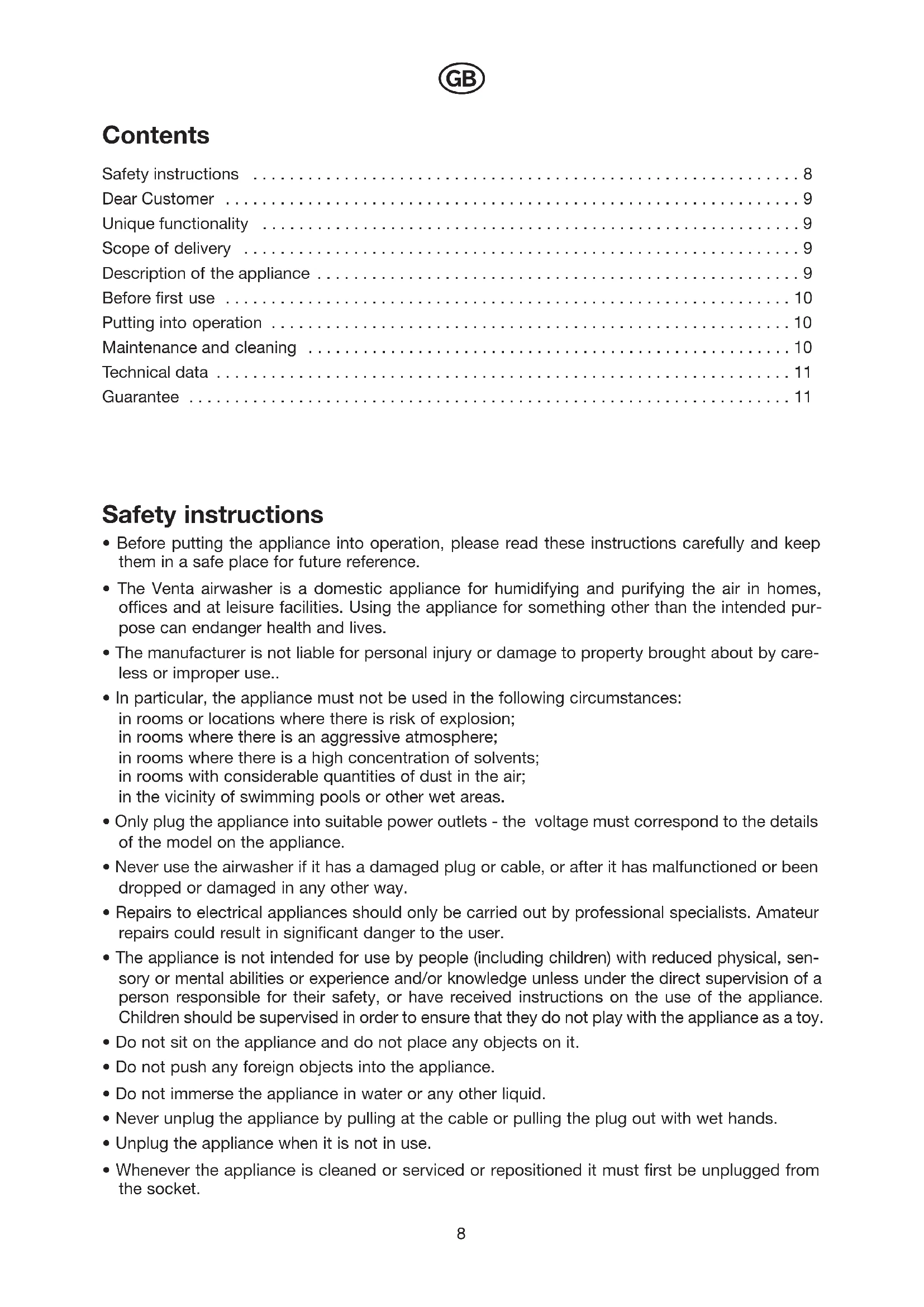 - The Venta airwasher is a domestic appliance for humidifying and purifying the air in homes, offices and at leisure facilities. Using the appliance for something other than the intended pur- pose can endanger health and lives.