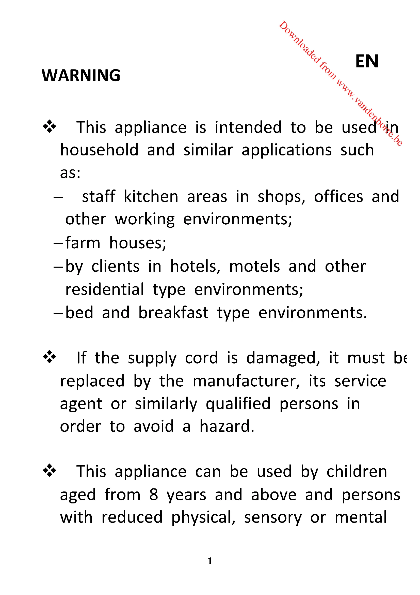 bed and breakfast type environments. If the supply cord is damaged, it must be replaced by the manufacturer, its service agent or similarly qualified persons in order to avoid a hazard. This appliance can be used by children aged from 8 years and above and persons with reduced physical, sensory or mental Downloaded from www.vandenborre.beEN