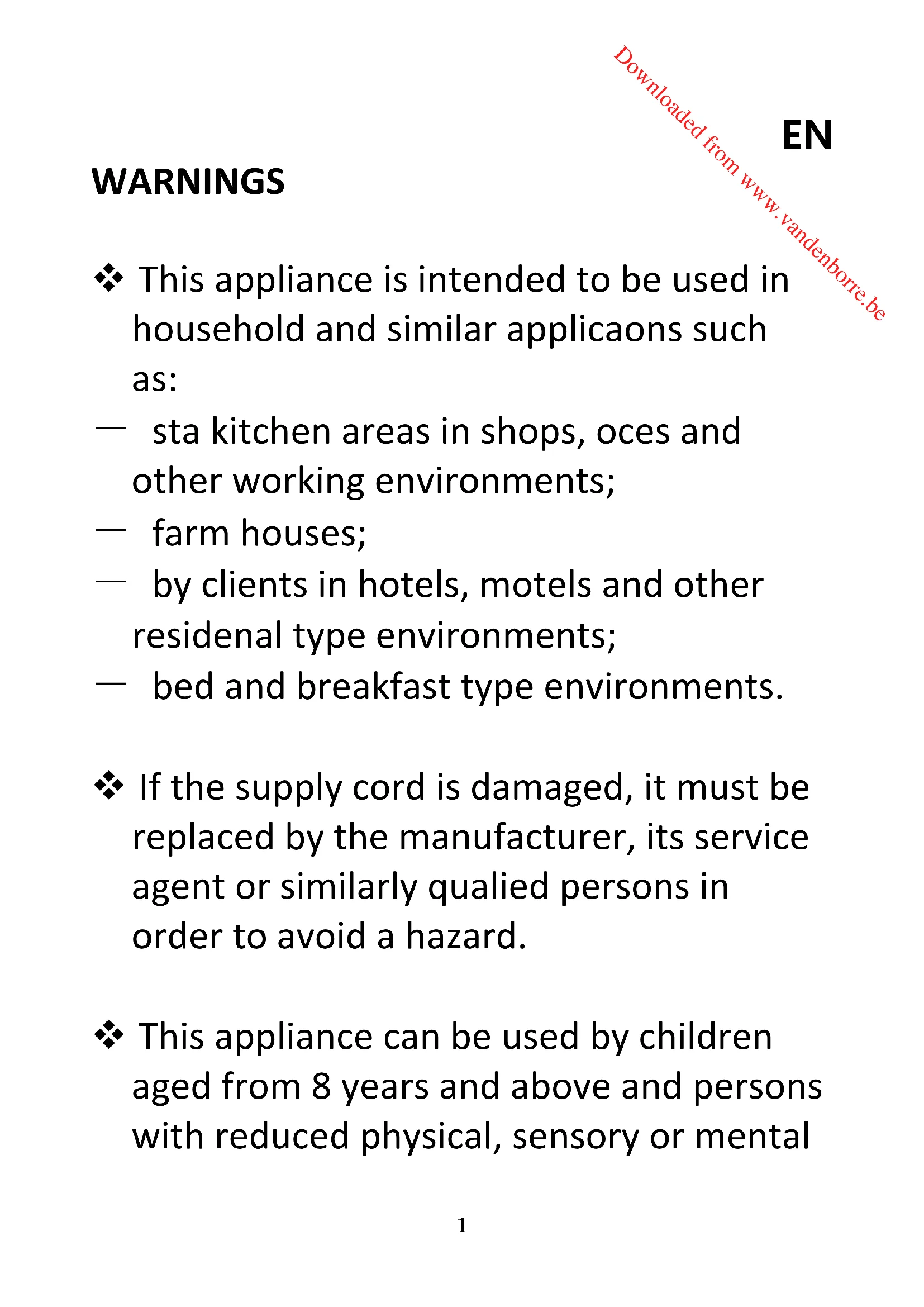 WARNINGS This appliance is intended to be used in household and similar applications such as: - staff kitchen areas in shops, offices and other working environments; - farm houses; - by clients in hotels, motels and other residential type environments; - bed and breakfast type environments. If the supply cord is damaged, it must be replaced by the manufacturer, its service agent or similarly qualified persons in order to avoid a hazard. This appliance can be used by children aged from 8 years and above and persons with reduced physical, sensory or mental Downloaded from www.vandenborre.beEN