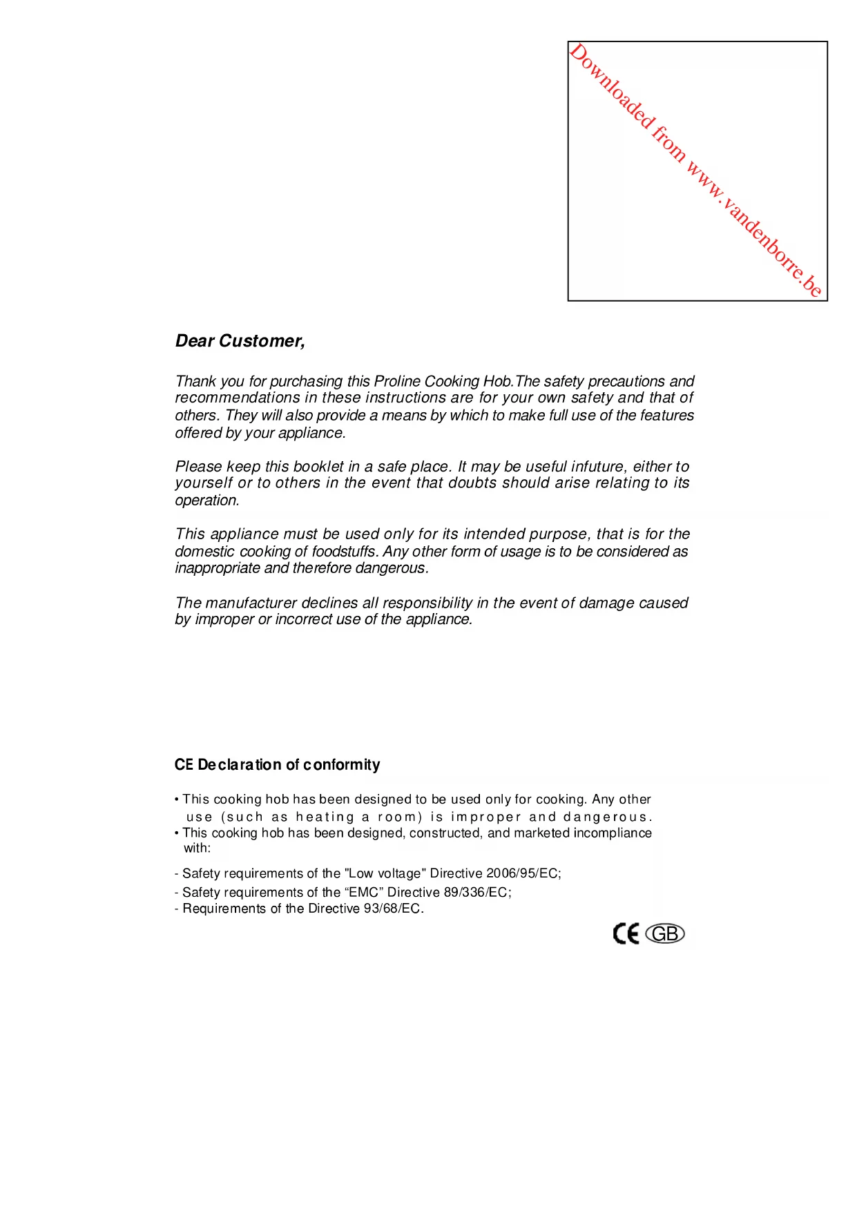 - This cooking hob has been designed, constructed, and marketed incompliance with: - Safety requirements of the - Safety requirements of the “EMC” Directive 89/336/EC; - Requirements of the Directive 93/68/EC. "Low voltage" Directive 2006/95/EC; GBDownloaded from www.vandenborre.be BEFORE USING FOR THE FIRST TIME . Read the instructions carefully before installing and using the appliance. After unpacking the appliance, make sure it is not damaged. In case of doubt, do not use the appliance and contact your supplier or a qualified engineer. . Remove all packaging and do not leave the packing material (plastic bags, polystyrene, bands etc ) in easy reach of children as they may cause serious injury. The packaging materials are recyclable. . The appliance should be installed and all the electrical connections made by a qualified engineer in compliance with local regulations in force and following the manufacturers instructions. . Do not attempt to modify the technical properties of the appliance, as it may become dangerous to use. Note: Appearance of your hob maybe different than the model shown above due to production changes. SINGLE ZONE HEATERHOBFRAME CERAMIC SURFACETOUCH CONTROL PANEL