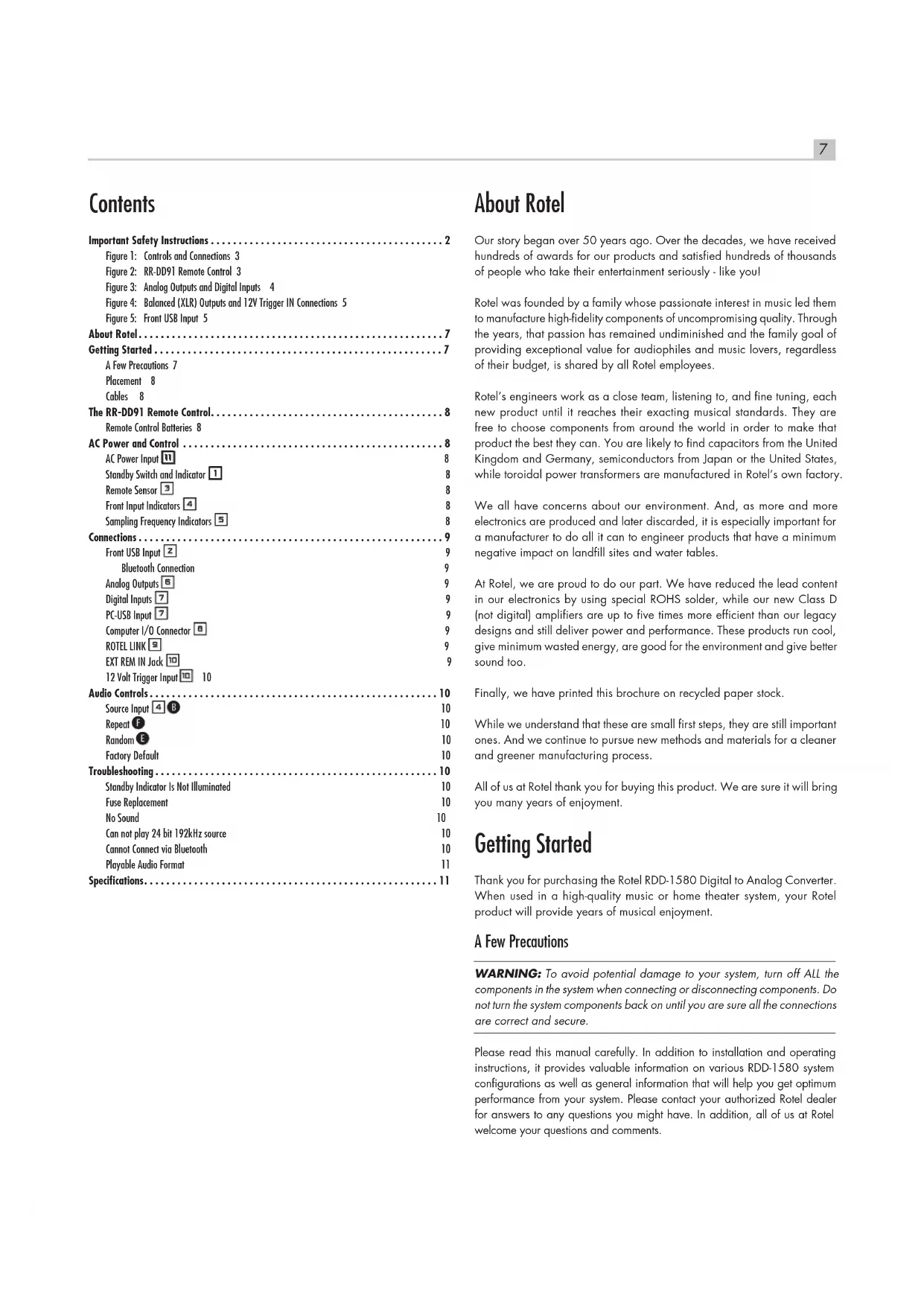 - components in the system when connecting or disconnecting components. Do not turn the system components back on until you are sure all the connections are correct and secure. Please read this manual carefully. In addition to installation and operating instructions, it provides valuable information on various RDD-1580 system configurations as well as general information that will help you get optimum performance from your system. Please contact your authorized Rotel dealer for answers to any questions you might have. In addition, all of us at Rotel welcome your questions and comments. Contents Important Safety Instructions p. 2