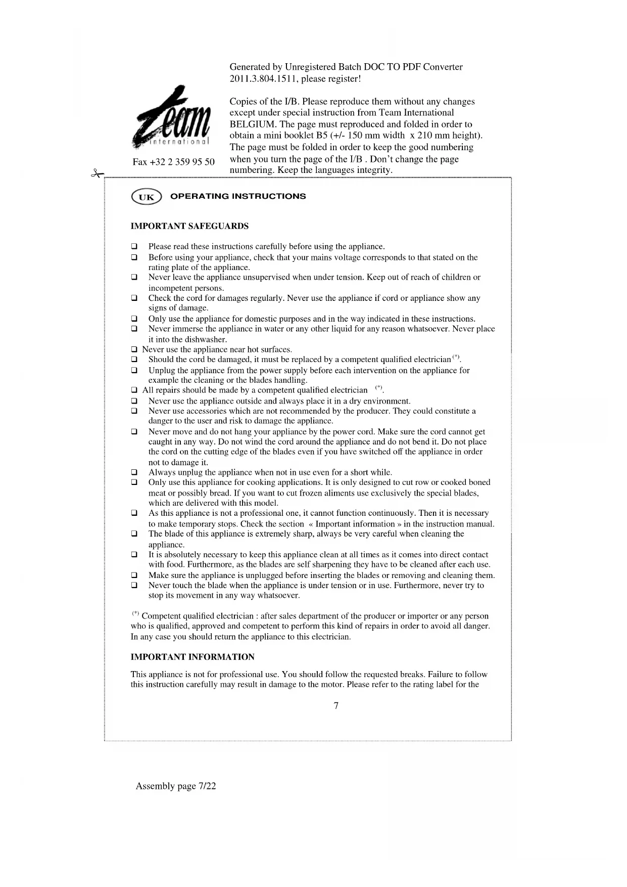 Competent qualified electrician : after sales department of the producer or importer or any person who is qualified, approved and competent to perform this kind of repairs in order to avoid all danger. In any case you should return the appliance to this electrician. IMPORTANT INFORMATION This appliance is not for professional use. You should follow the requested breaks. Failure to follow this instruction carefully may result in damage to the motor. Please refer to the rating label for theGenerated by Unregistered Batch DOC TO PDF Converter 2011.3.804.1511, please register! Copies of the I/B. Please reproduce them without any changes except under special instruction from Team International BELGIUM. The page must reproduced and folded in order to obtain a mini booklet B5 (+/- 150 mm width x 210 mm height). The page must be folded in order to keep the good numbering when you turn the page of the I/B . Don’t change the page numbering. Keep the languages integrity.