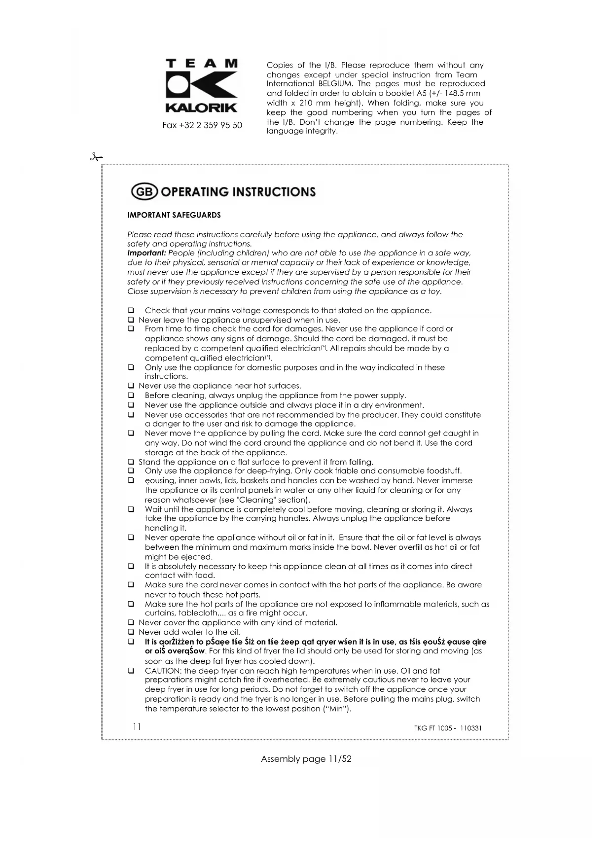 Copies of the I/B. Please reproduce them without any changes except under special instruction from Team International BELGIUM. The pages must be reproduced and folded in order to obtain a booklet A5 (+/- 148.5 mm width x 210 mm height). When folding, make sure you keep the good numbering when you turn the pages of the I/B. Don’t change the page numbering. Keep the language integrity.