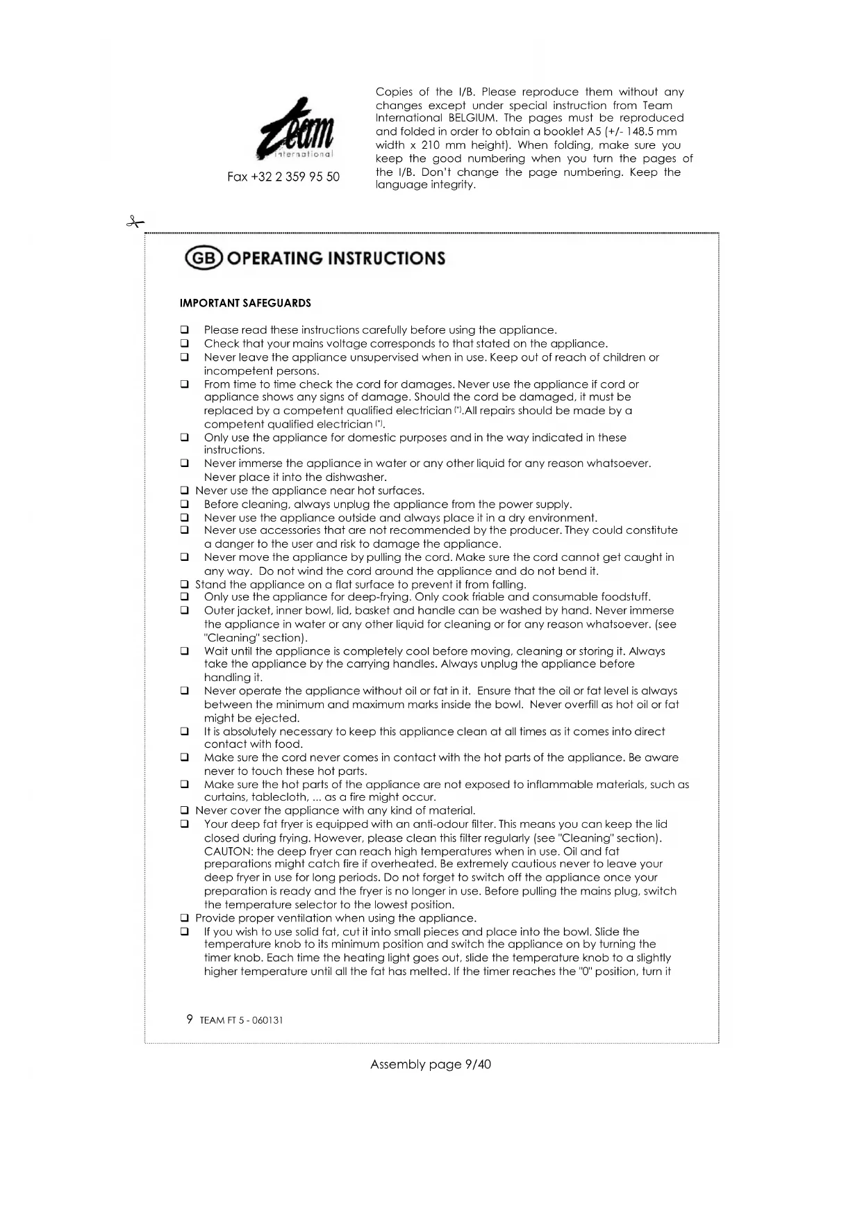 Copies of the I/B. Please reproduce them without any changes except under special instruction from Team International BELGIUM. The pages must be reproduced and folded in order to obtain a booklet A5 (+/- 148.5 mm width x 210 mm height). When folding, make sure you keep the good numbering when you turn the pages of the I/B. Don't change the page numbering. Keep the language integrity.