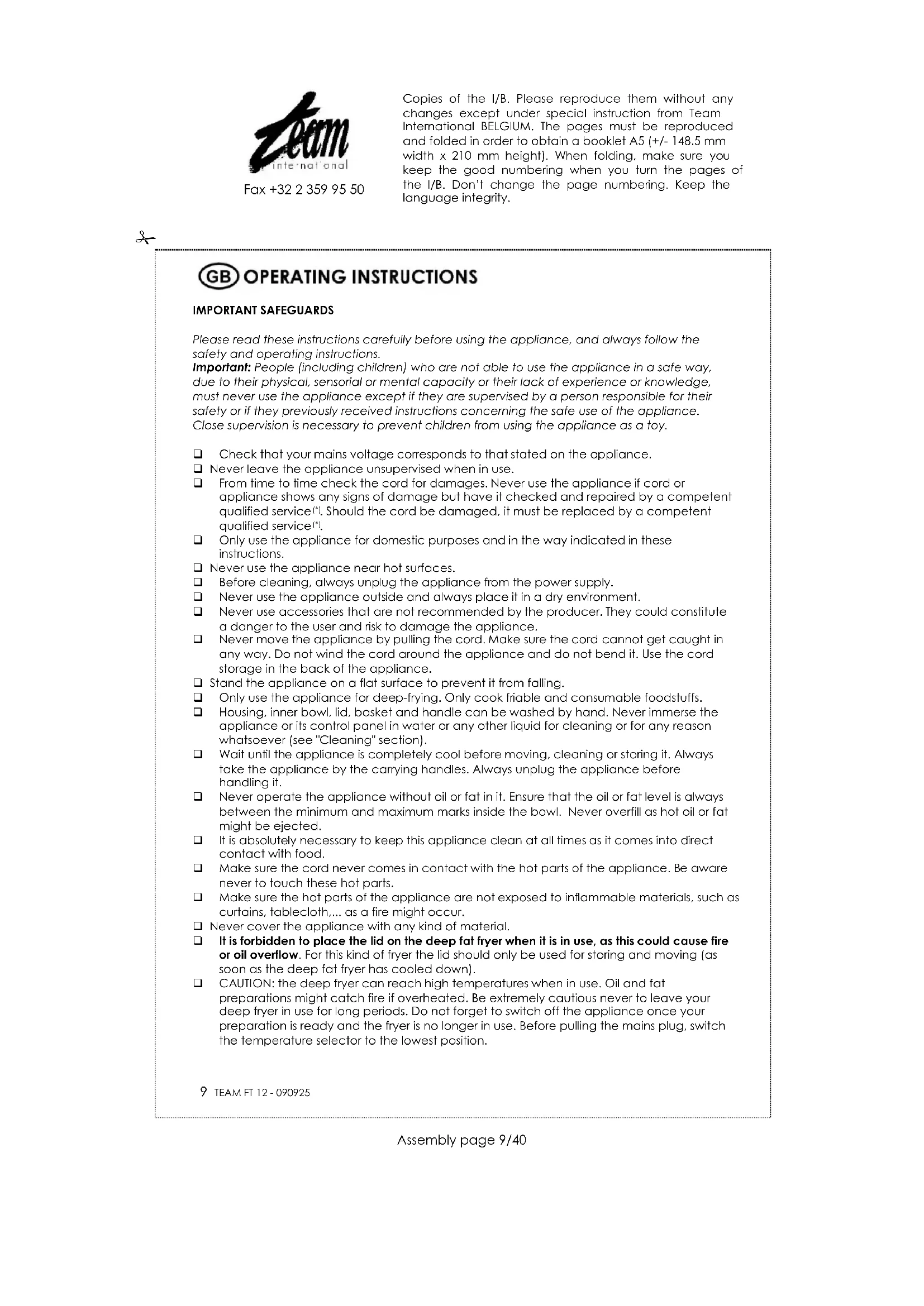 CLEANING Caution: never immerse the appliance in water or any other liquid. Unplug the deep fat fryer. Wait until the unit is completely cool before cleaning. Be careful when touching the heating element as it might stay hot for quite some time after you have unplugged the appliance. NEVER IMMERSE THE CONTROL PANEL IN WATER OR ANY OTHER LIQUID FOR ANY REASON WHATSOEVER. Follow the section „Disassembling the deep fat fryer‟. Do not use strong detergents or abrasive cloths/liquid, as this will damage the deep fat fryer. Clean the fryer with warm soapy water. It may help to soak the parts for a short time. Thoroughly dry all parts of the appliance. Change the oil regularly. To assemble, follow the section „Assembling the deep fat fryer‟. Copies of the I/B. Please reproduce them without any changes except under special instruction from Team International BELGIUM. The pages must be reproduced and folded in order to obtain a booklet A5 (+/- 148.5 mm width x 210 mm height). When folding, make sure you keep the good numbering when you turn the pages of the I/B. Don‟t change the page numbering. Keep the language integrity.