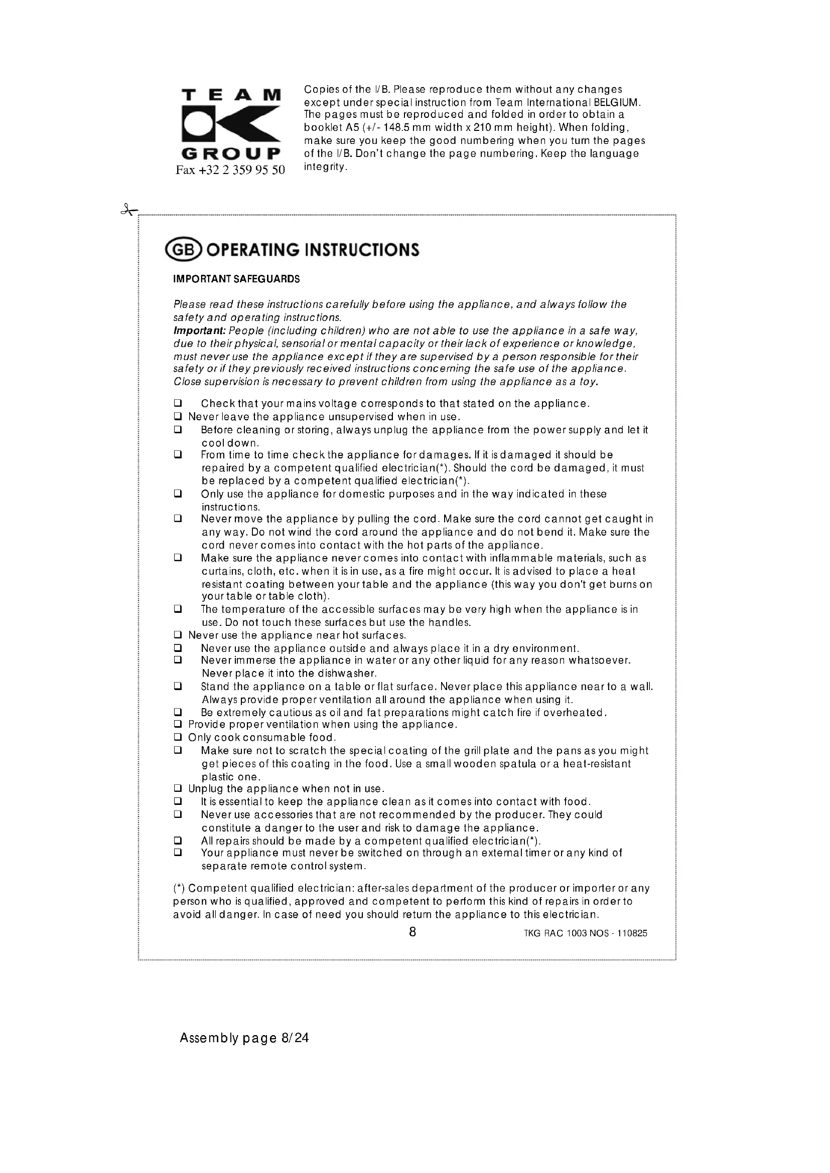 Assembly page 8/24Copies of the I/B. Please reproduce them without any changes except under special instruction from Team International BELGIUM. The pages must be reproduced and folded in order to obtain a booklet A5 (+/- 148.5 mm width x 210 mm height). When folding, make sure you keep the good numbering when you turn the pages of the I/B. Don’t change the page numbering. Keep the language integrity. Fax +32 2 359 95 50