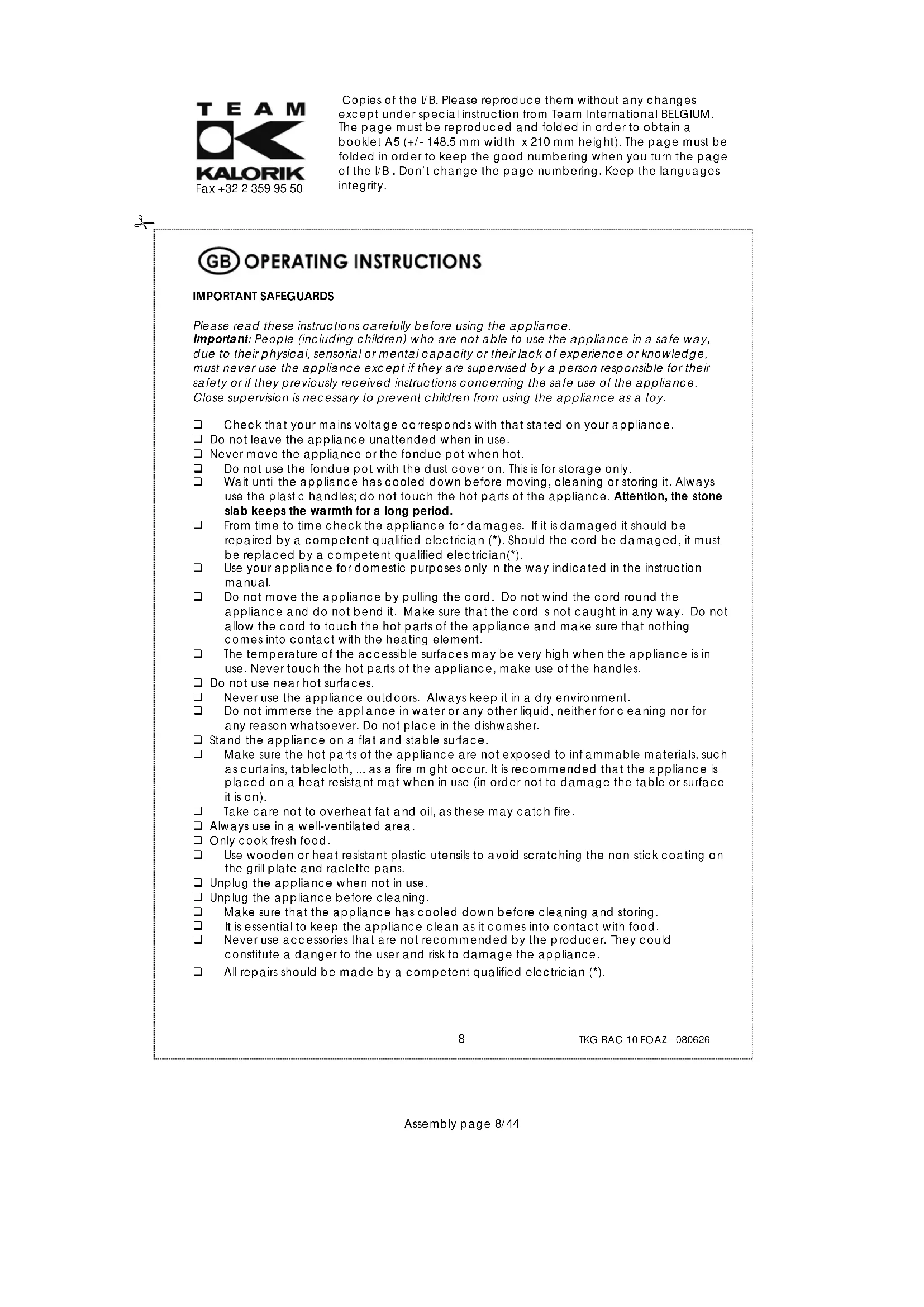 Assembly page 8/44Copies of the I/B. Please reproduce them without any changes except under special instruction from Team International BELGIUM. The page must be reproduced and folded in order to obtain a booklet A5 (+/- 148.5 mm width x 210 mm height). The page must be folded in order to keep the good numbering when you turn the page of the I/B . Don’t change the page numbering. Keep the languages integrity. Fax +32 2 359 95 50