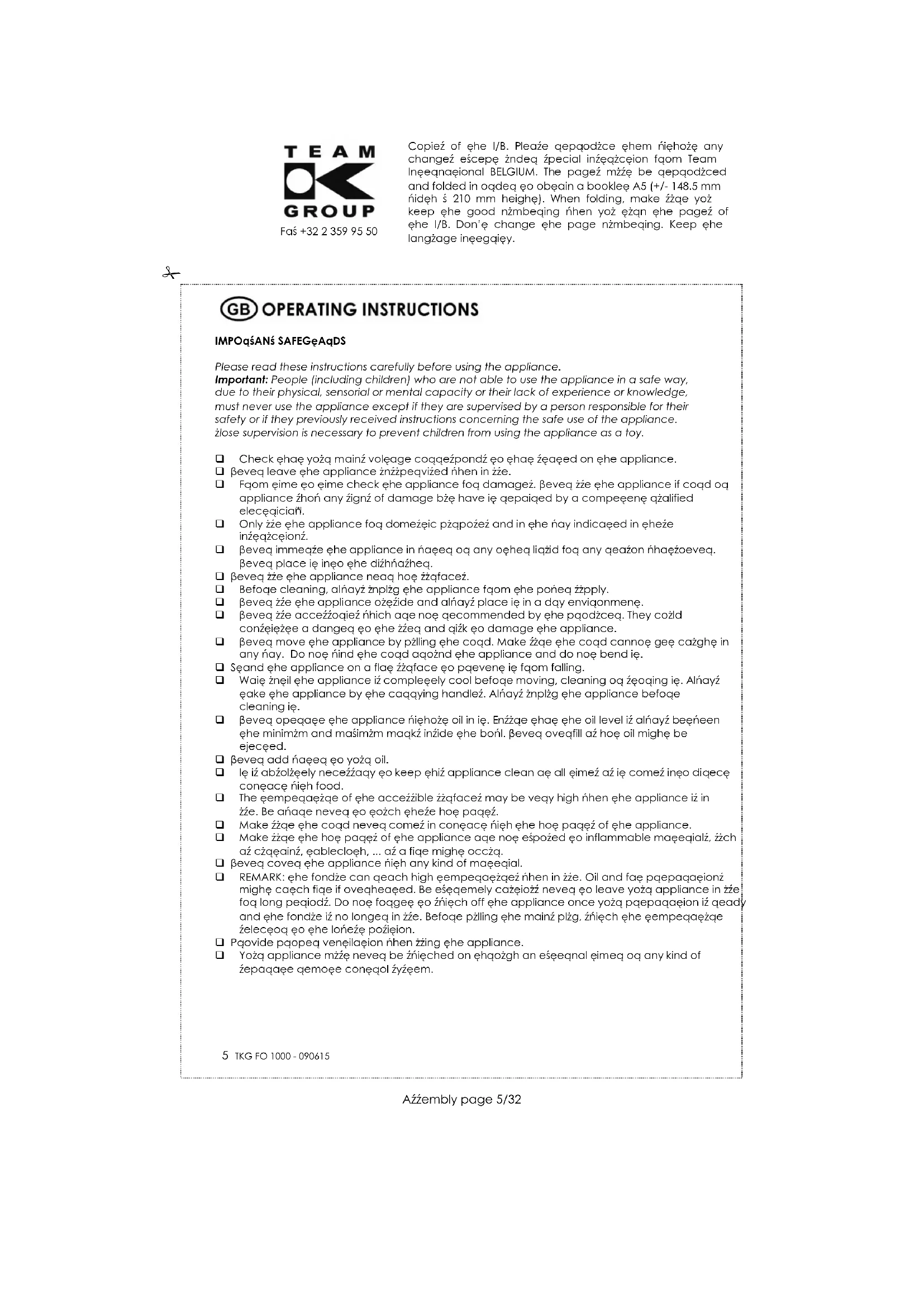 Copies of the I/B. Please reproduce them without any changes except under special instruction from Team International BELGIUM. The pages must be reproduced and folded in order to obtain a booklet A5 (+/- 148.5 mm width x 210 mm height). When folding, make sure you keep the good numbering when you turn the pages of the I/B. Don’t change the page numbering. Keep the language integrity. Front cover page (first page) Assembly page 1/32