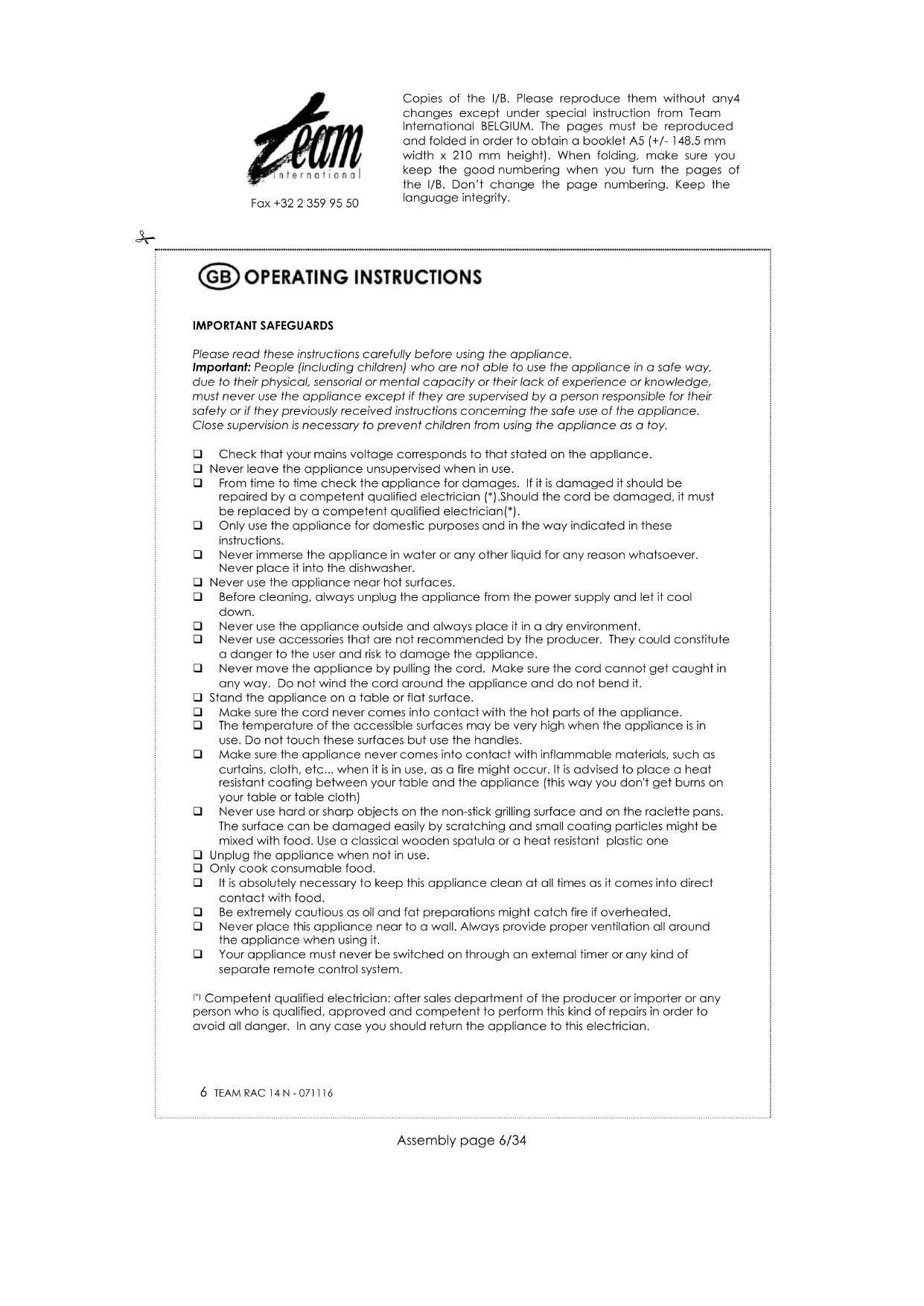 Competent qualified electrician: after sales department of the producer or importer or any person who is qualified, approved and competent to perform this kind of repairs in order to avoid all danger. In any case you should return the appliance to this electrician. Copies of the I/B. Please reproduce them without any4 changes except under special instruction from Team International BELGIUM. The pages must be reproduced and folded in order to obtain a booklet A5 (+/- 148.5 mm width x 210 mm height). When folding, make sure you keep the good numbering when you turn the pages of the I/B. Don’t change the page numbering. Keep the language integrity.