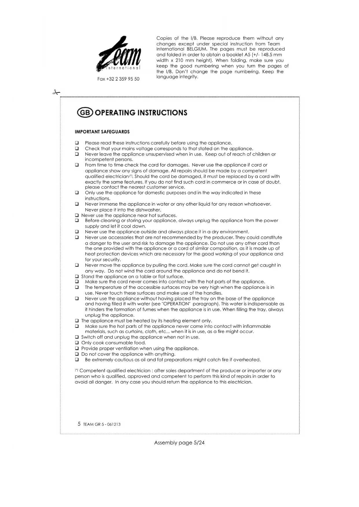 TEAM GR 5 230V~ 1500W Copies of the I/B. Please reproduce them without any changes except under special instruction from Team International BELGIUM. The pages must be reproduced and folded in order to obtain a booklet A5 (+/- 148.5 mm width x 210 mm height). When folding, make sure you keep the good numbering when you turn the pages of the I/B. Don’t change the page numbering. Keep the language integrity.