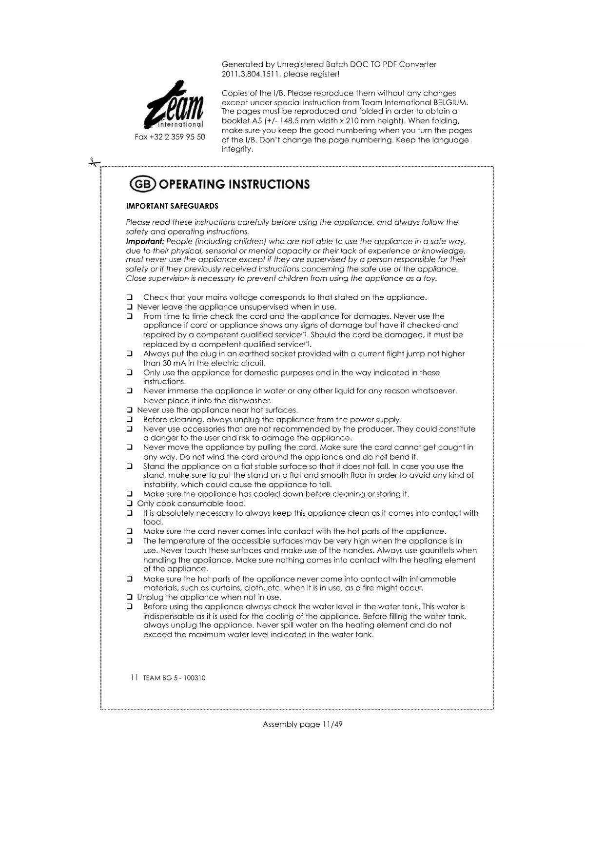 Copies of the I/B. Please reproduce them without any changes except under special instruction from Team International BELGIUM. The pages must be reproduced and folded in order to obtain a booklet A5 (+/- 148.5 mm width x 210 mm height). When folding, make sure you keep the good numbering when you turn the pages of the I/B. Don't change the page numbering. Keep the language integrity.