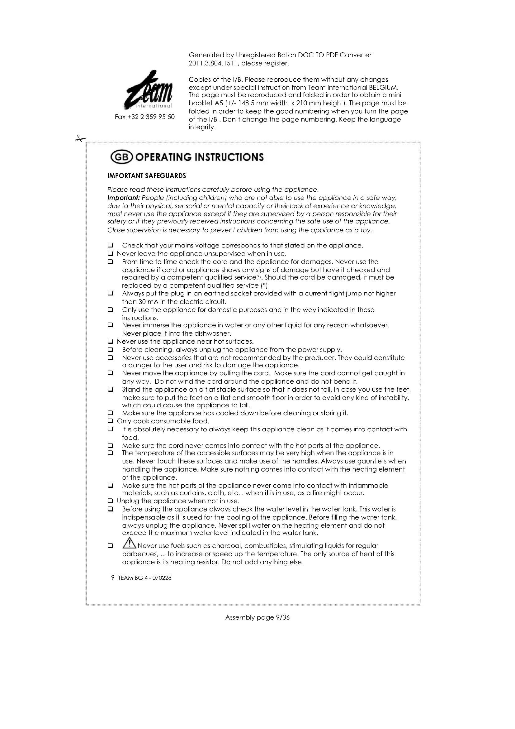 230 V ~ 2000 W I/B Version 070228Generated by Unregistered Batch DOC TO PDF Converter 2011.3.804.1511, please register! Copies of the I/B. Please reproduce them without any changes except under special instruction from Team International BELGIUM. The page must be reproduced and folded in order to obtain a mini booklet A5 (+/- 148.5 mm width x 210 mm height). The page must be folded in order to keep the good numbering when you turn the page of the I/B . Don’t change the page numbering. Keep the language integrity.