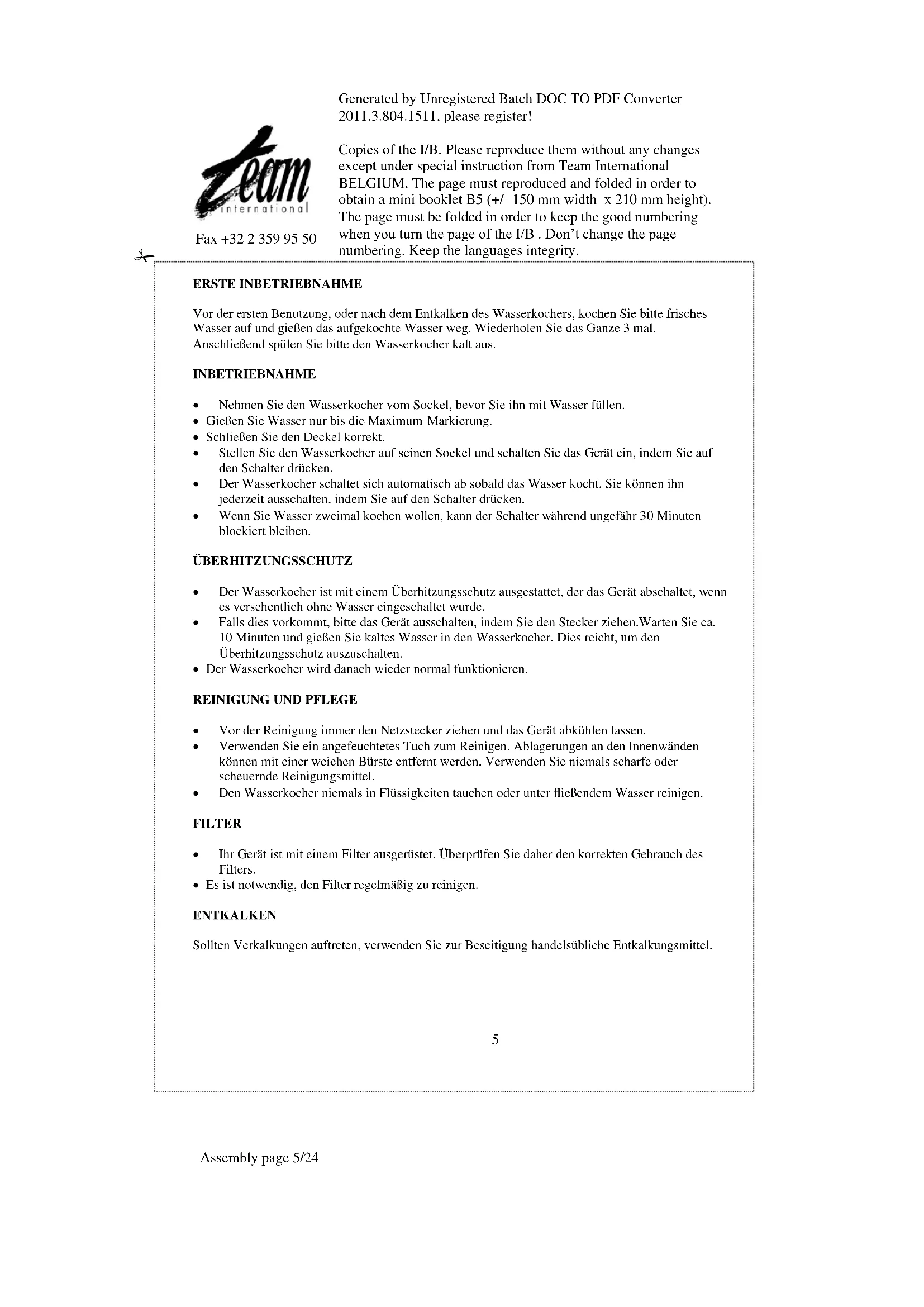 Before attempting any cleaning operation make sure the appliance is unplugged from the supply socket and fully cooled down. To clean the exterior surfaces, simply wipe over with a soft damp cloth and dry thoroughly. On no account must the jug kettle or its power base be immersed in water. Do not allow heavy scale deposits to build up on the element. There are various preparations available that remove scale without damaging your jug kettle. Make sure to use a type recommended for plastic kettles. FILTER Your appliance is provided with a filter. When you want to boil water, settle the filter first. Filter should be rinsed clean regularly.Generated by Unregistered Batch DOC TO PDF Converter 2011.3.804.1511, please register! Copies of the I/B. Please reproduce them without any changes except under special instruction from Team International BELGIUM. The page must reproduced and folded in order to obtain a mini booklet B5 (+/- 150 mm width x 210 mm height). The page must be folded in order to keep the good numbering when you turn the page of the I/B . Don’t change the page numbering. Keep the languages integrity.