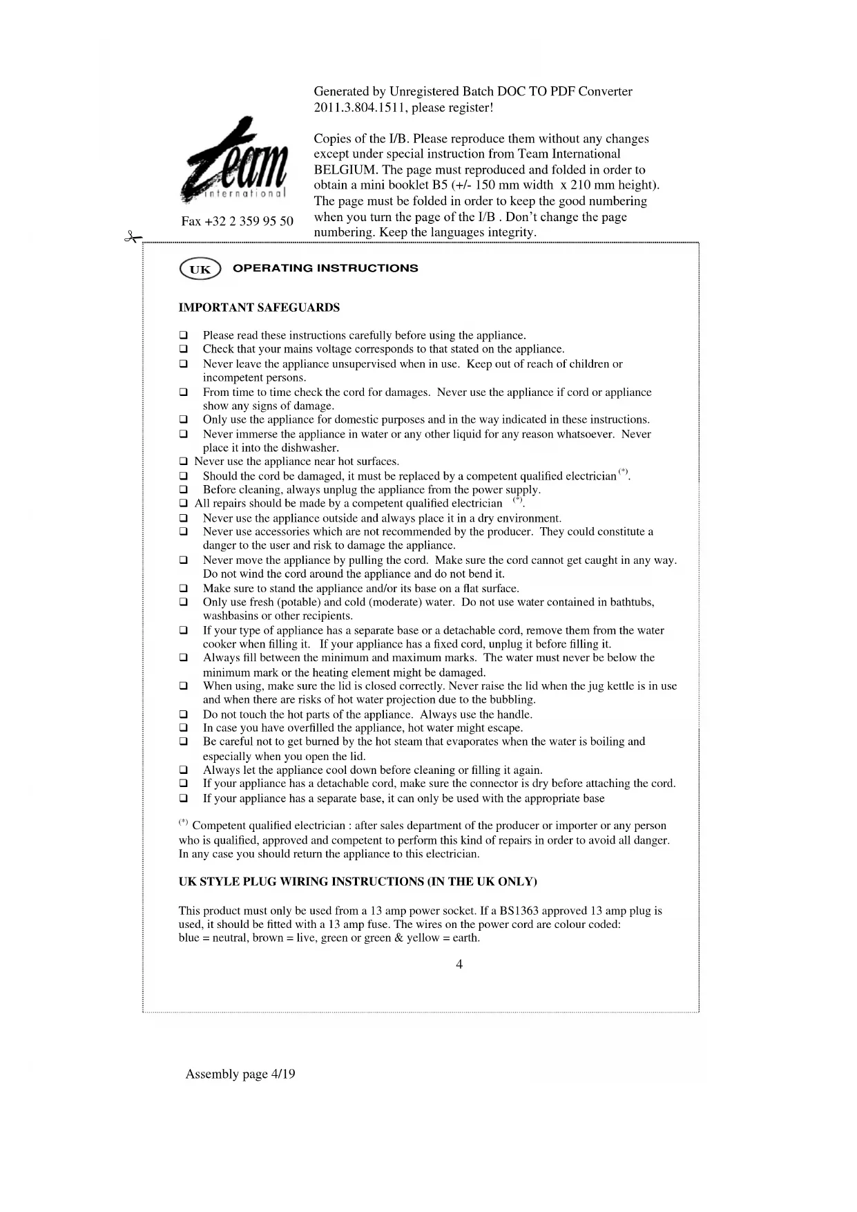 Competent qualified electrician : after sales department of the producer or importer or any person who is qualified, approved and competent to perform this kind of repairs in order to avoid all danger. In any case you should return the appliance to this electrician. UK STYLE PLUG WIRING INSTRUCTIONS (IN THE UK ONLY) This product must only be used from a 13 amp power socket. If a BS1363 approved 13 amp plug is used, it should be fitted with a 13 amp fuse. The wires on the power cord are colour coded: blue = neutral, brown = live, green or green & yellow = earth.Generated by Unregistered Batch DOC TO PDF Converter 2011.3.804.1511, please register! Copies of the I/B. Please reproduce them without any changes except under special instruction from Team International BELGIUM. The page must reproduced and folded in order to obtain a mini booklet B5 (+/- 150 mm width x 210 mm height). The page must be folded in order to keep the good numbering when you turn the page of the I/B . Don’t change the page numbering. Keep the languages integrity.