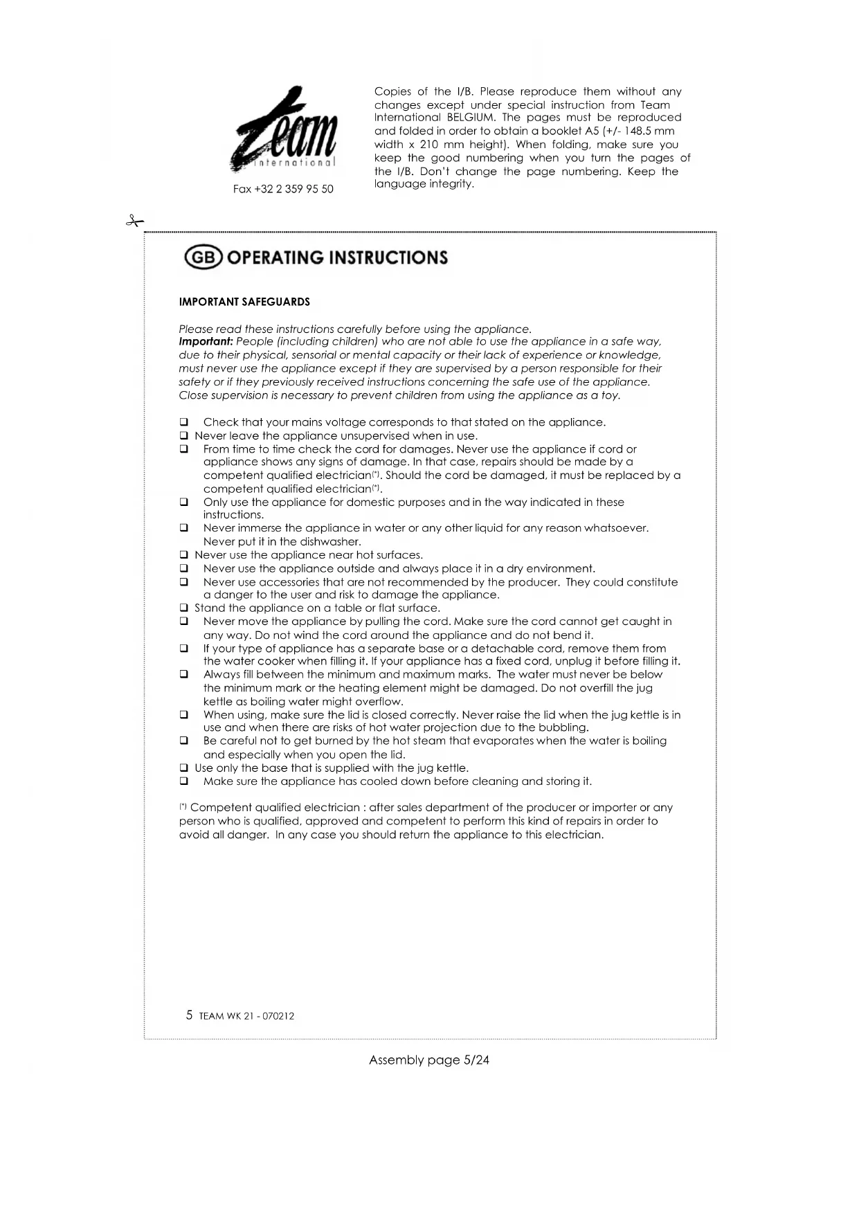 TEAM WK 21 230 V ~ 2000 W Copies of the I/B. Please reproduce them without any changes except under special instruction from Team International BELGIUM. The pages must be reproduced and folded in order to obtain a booklet A5 (+/- 148.5 mm width x 210 mm height). When folding, make sure you keep the good numbering when you turn the pages of the I/B. Don’t change the page numbering. Keep the language integrity.