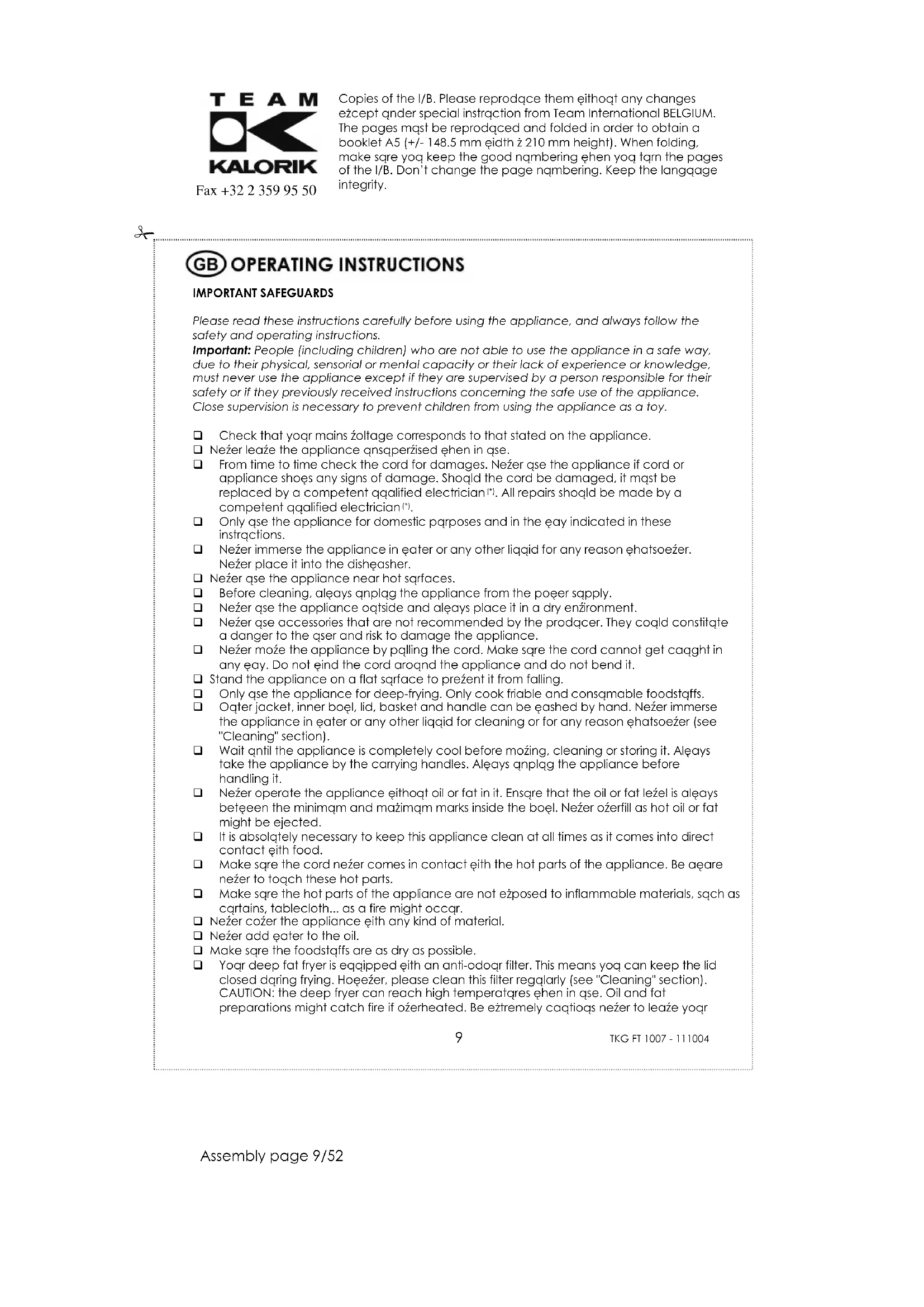- Nunca encha em demasia o cesto da fritura.Copies of the I/B. Please reproduce them without any changes except under special instruction from Team International BELGIUM. The pages must be reproduced and folded in order to obtain a booklet A5 (+/- 148.5 mm width x 210 mm height). When folding, make sure you keep the good numbering when you turn the pages of the I/B. Don’t change the page numbering. Keep the language integrity.