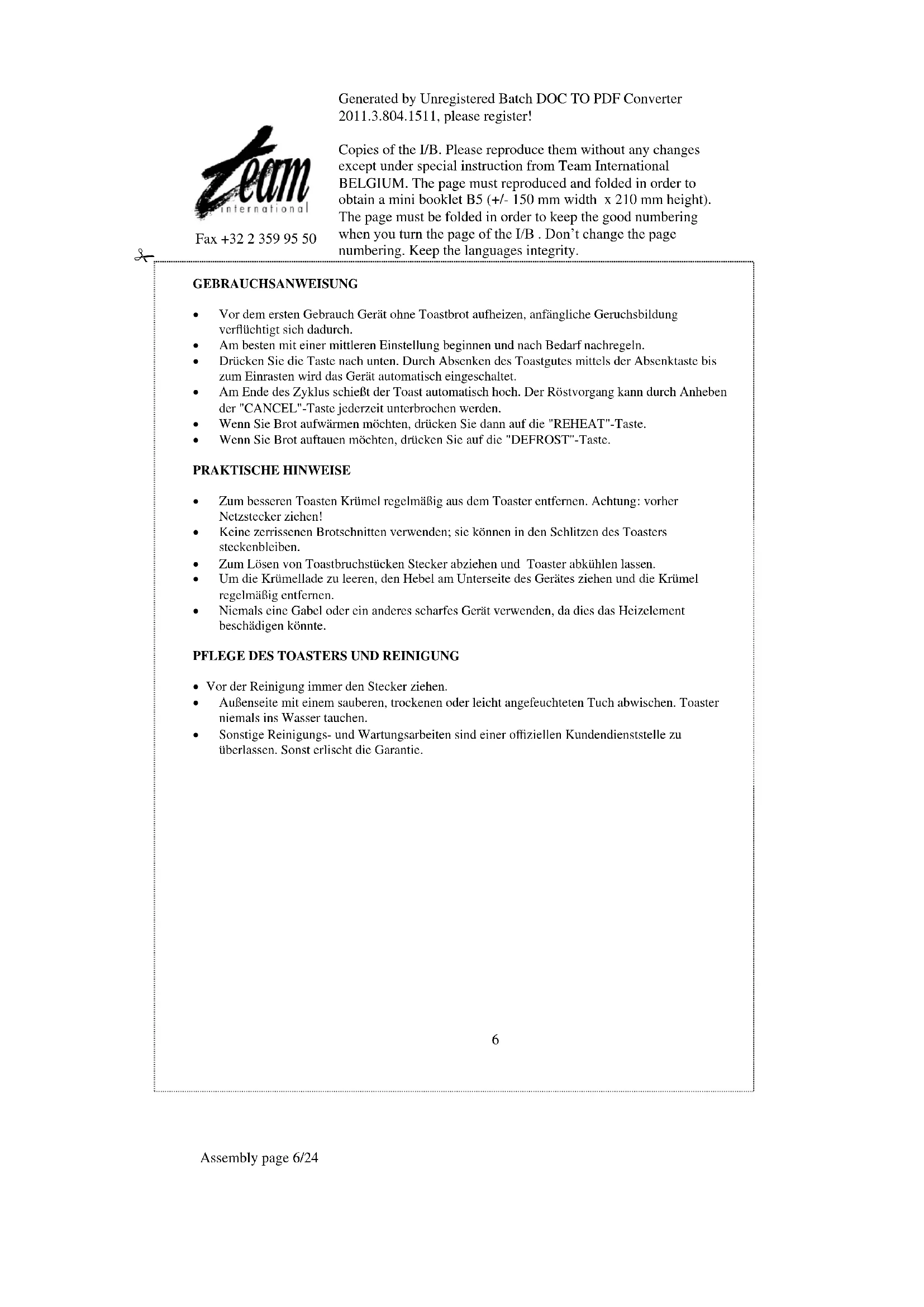 Fax +32 2 359 95 50 Generated by Unregistered Batch DOC TO PDF Converter 2011.3.804.1511, please register! Copies of the I/B. Please reproduce them without any changes except under special instruction from Team International BELGIUM. The page must reproduced and folded in order to obtain a mini booklet B5 (+/- 150 mm width x 210 mm height). The page must be folded in order to keep the good numbering when you turn the page of the I/B . Don’t change the page numbering. Keep the languages integrity.